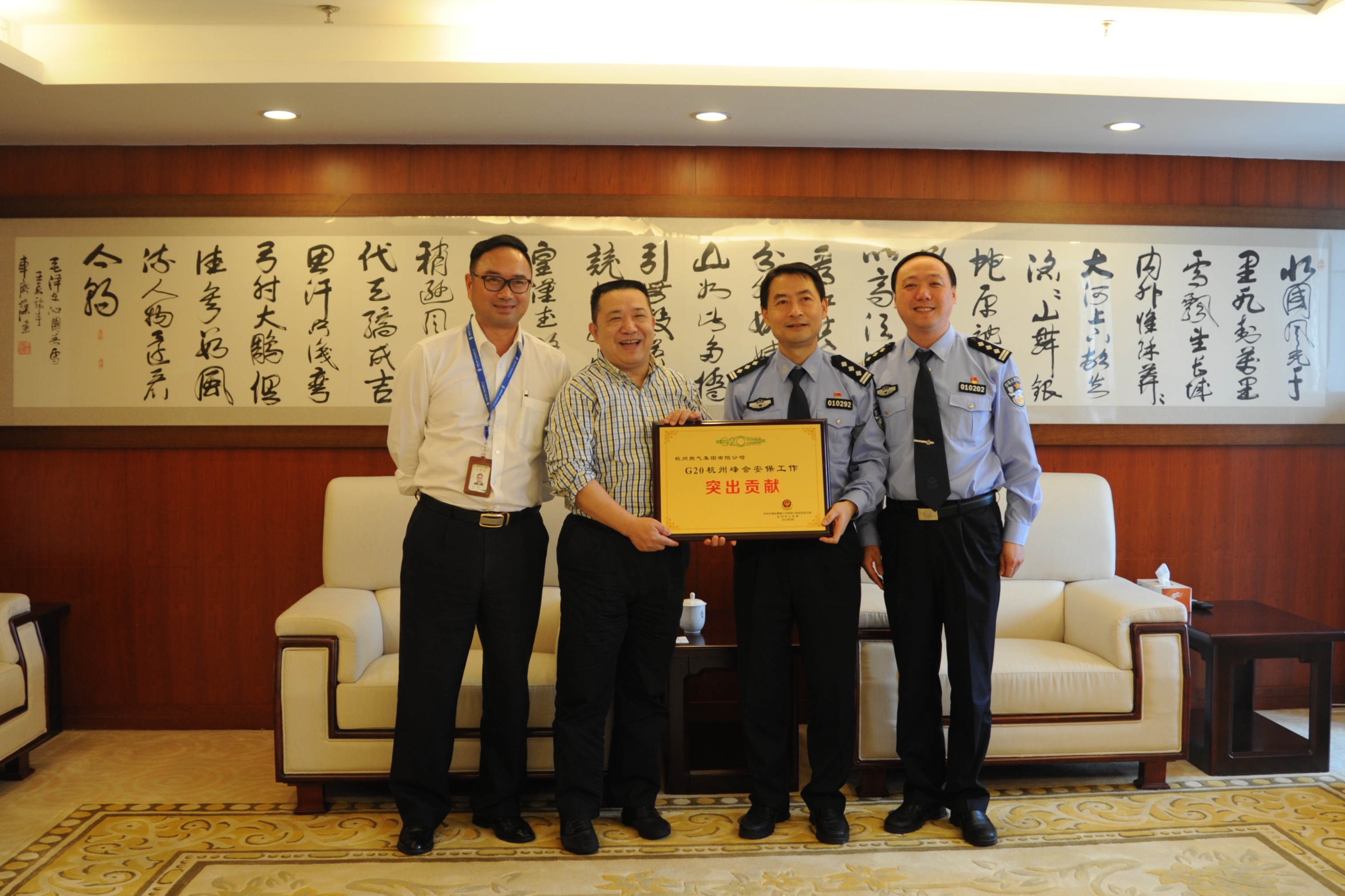 10月13日,杭州市公安局经文保支队副支队长张剑峰、后勤保障部主任吴晓家一行到访集团公司,专程送来“G20杭州峰会安保工作突出贡献”荣誉奖牌以及感谢信、勋章,以感谢银河官网 在管线建设、场站安保、武警进驻等工作中的积极配合。集团党委书记、董事长芦俊对张剑峰副支队长一行的来访表示感谢,并强调:首先要对市公安局长期以来对银河官网 工作的支持与帮助表示由衷地感谢,银河官网 也将一如既往的积极配合市公安局的各项工作。