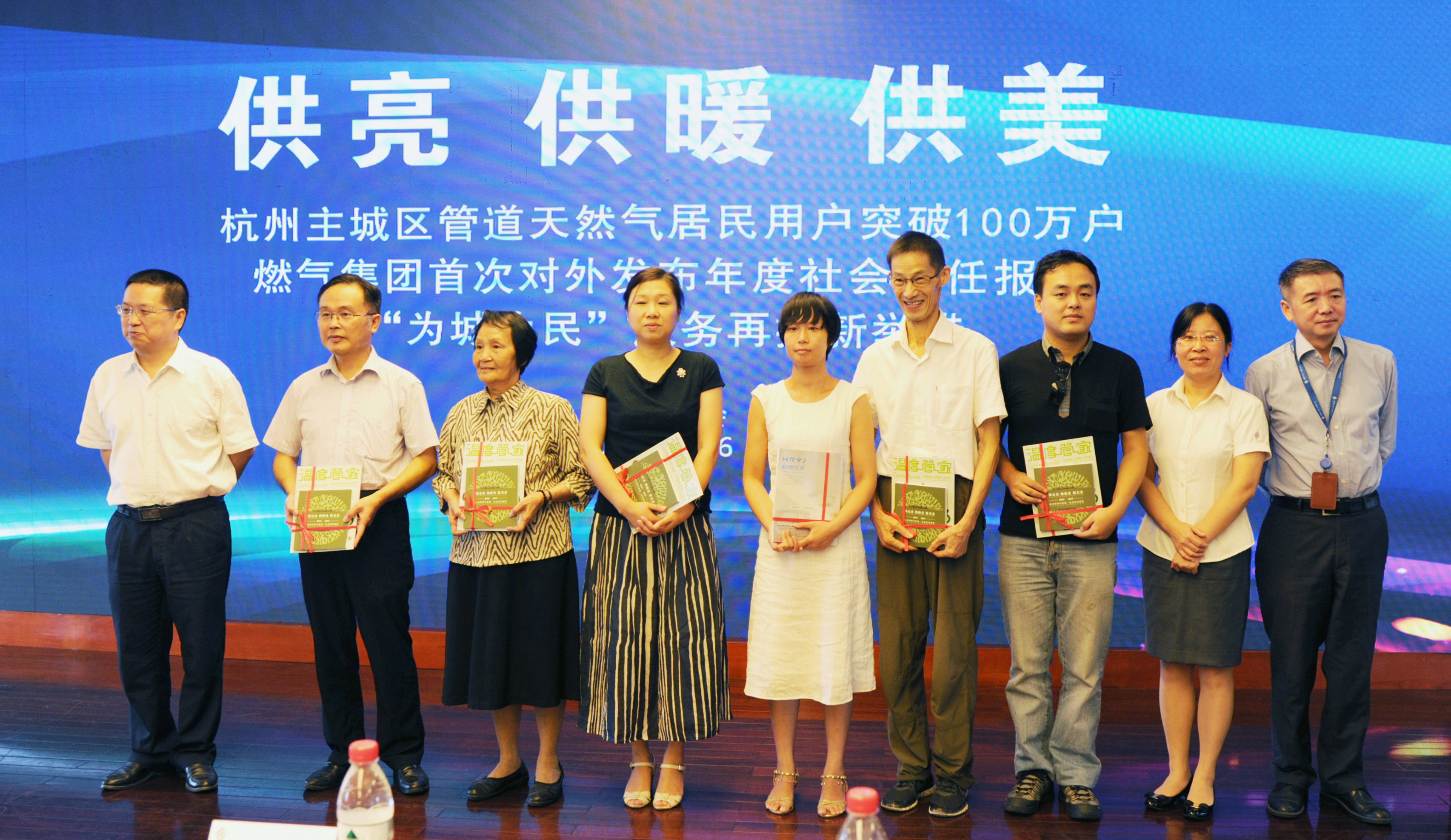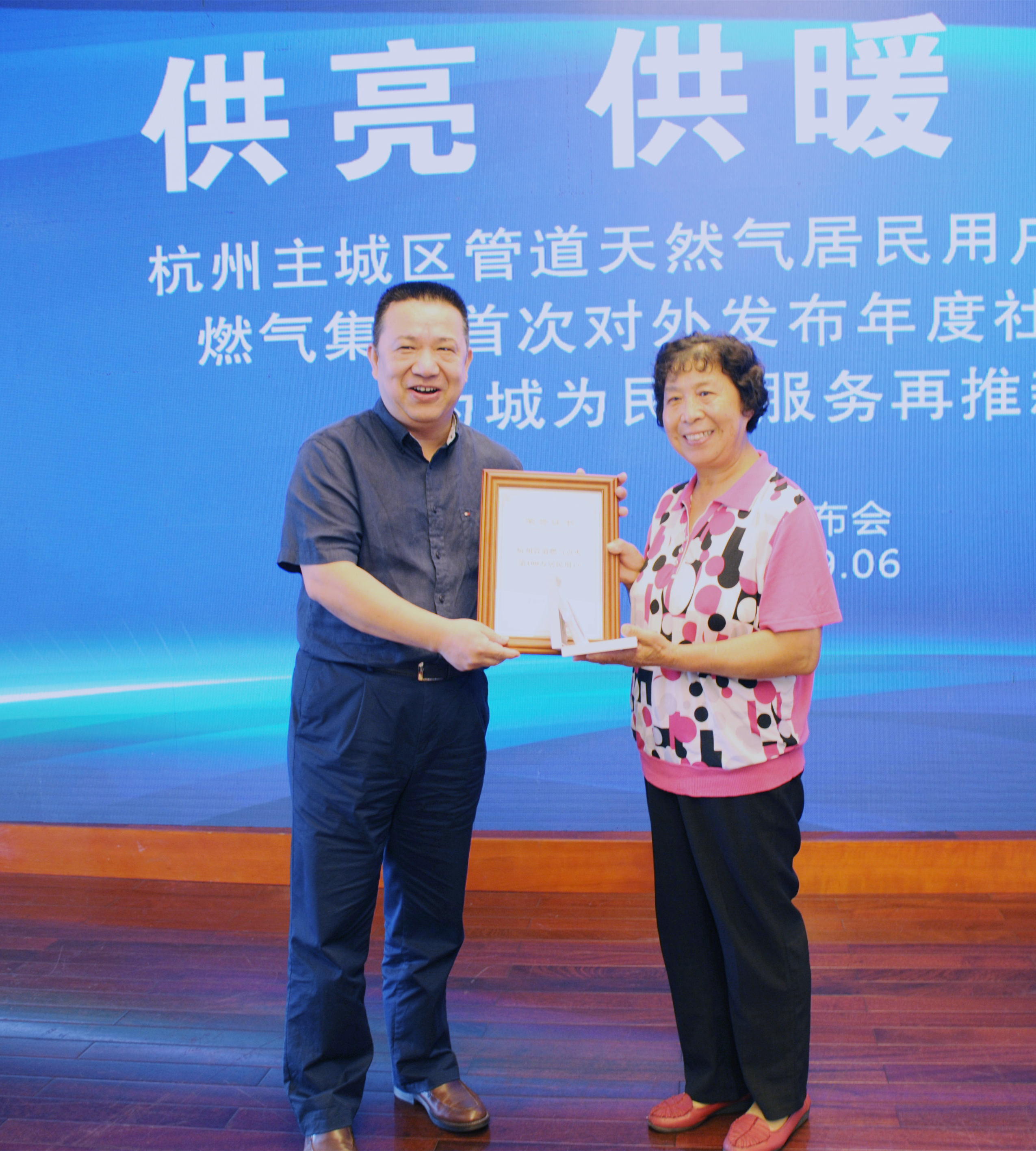 发布会现场,还播放了第1户管道气用户及第100万户管道天然气用户采访视频,芦俊董事长为第100万户用户颁发纪念品并赠送银河 优家产品。集团公司王忠平、朱琴君副总经理,杭天公司沈剑平总经理向市民代表及品质监督员赠送《社会责任报告》、《温度管家》。
