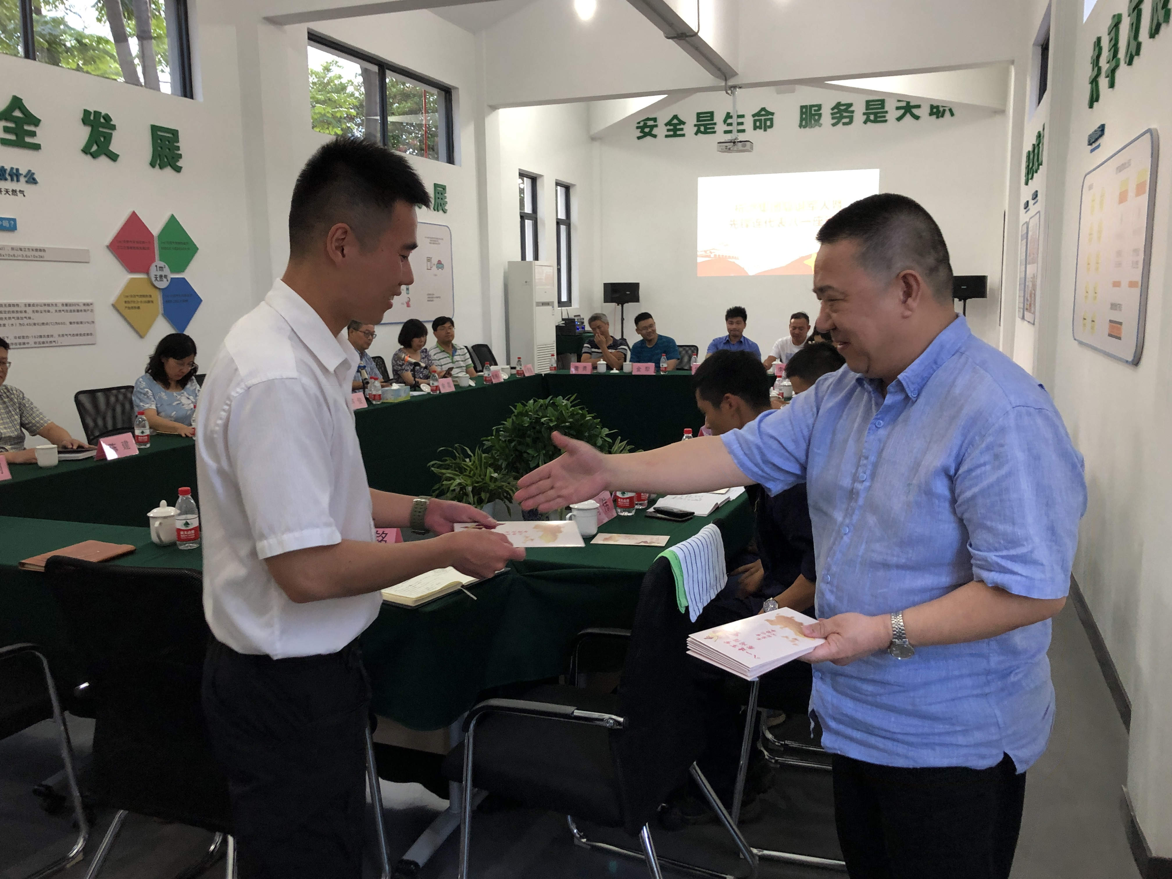 与会退伍军人代表深情回顾了当年难忘的军旅生活,并围绕集团战略目标实现、改革发展、创业创新、克难攻坚等方面,就如何继续发扬军队的优良传统,推动企业做强做优做大和实现集团“5441”发展战略进行座谈交流。工程公司项目三部经理范建强:为“当兵佬”自豪;钱江公司建设运行部运行班长金文昌:坚持制度自信、文化自信、技能自信、廉政自信;管网输配分公司管网运行科巡检工赖涛:打开人人成才的通道;服务发展公司安全运行部抢修工项凯迪:要有团队精神;高压储配分公司东部气源站运行工孟连华:创新发展大有可为;服务发展公司客户服务部采暖客户经理应嵊杭:争做“三十八军战士”优质服务版;高压储配分公司输配科维修工吴大顺:处理好人道与商道;管网输配分公司管网运行科巡检工陈栋:在巡检中找出经典性管理;管网输配分公司管网抢修科抢修工周军:紧要关头万无一失;高压储配分公司输配科运行工施炜帆:程式就是规范,仪式就是敬畏;桐庐银河 燃气有限公司输配运行部巡检巡护员兼调压员李林伟:要讲奉献;服务发展公司安全运行部抢修工华峰鸣:燃气安全服务基点在社区、在物业。