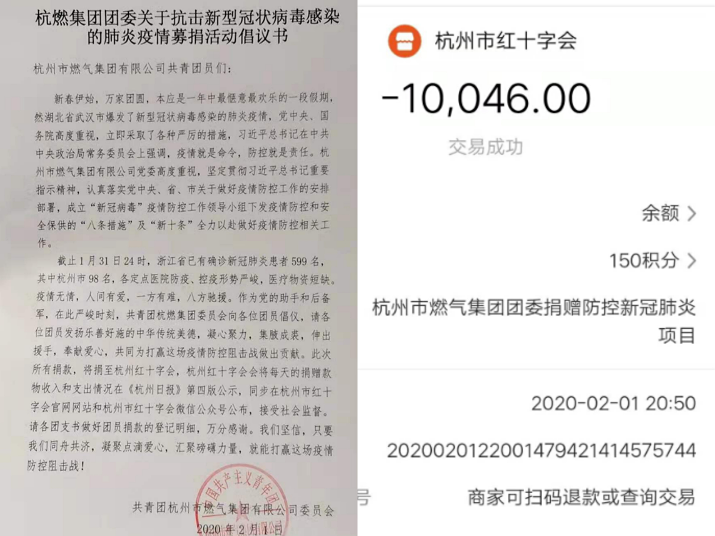 2月1日下午,团委以倡议书形式向全体青年团员发起募捐倡议,并通过各支部微信群进行转发扩散,呼吁团员尽己之力奉献爱心,为打赢这场疫情防控阻击战尽一份绵薄之力。捐款过程中,广大团员青年充分展现出关键时刻的责任担当,下属10个团支部书记带头捐款,其他团员积极响应,仅仅6小时,累计收到70名团干、团员捐款共计10046元(附表),由团委负责人统一以线上捐赠方式将捐赠款转入杭州市红十字会官方账户,用实际行动彰显青春作为,助力国家打赢疫情防控阻击战。