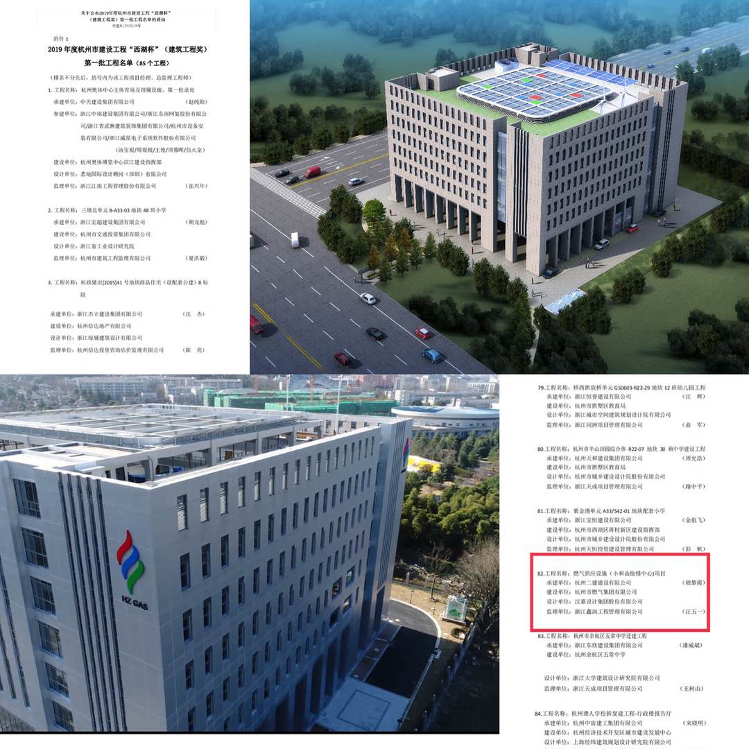 近日,杭州市银河官网 有限公司绿色能源体验中心(工程燃气供应设施(小和山抢修中心)项目,经过申报、初审、评议、表决、公示等多项程序严格审核,最终荣获2019年度杭州市建设工程最高奖项“西湖杯(建筑工程奖)”。