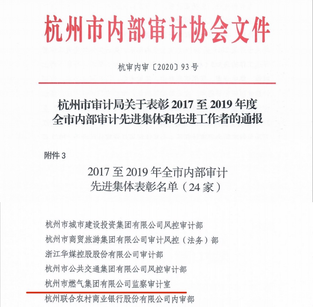 近日,银河官网 获得杭州市审计局颁发的杭州市2017-2019年内部审计先进集体和内部审计先进工作者荣誉。这是继获得浙江省2019年度“内部审计结果运用”典型经验评比三等奖、杭州市2019年度“内部审计结果运用”成果评比一等奖的基础上再次获奖,这些荣誉是上级审计部门对集团公司内审工作的充分肯定。
