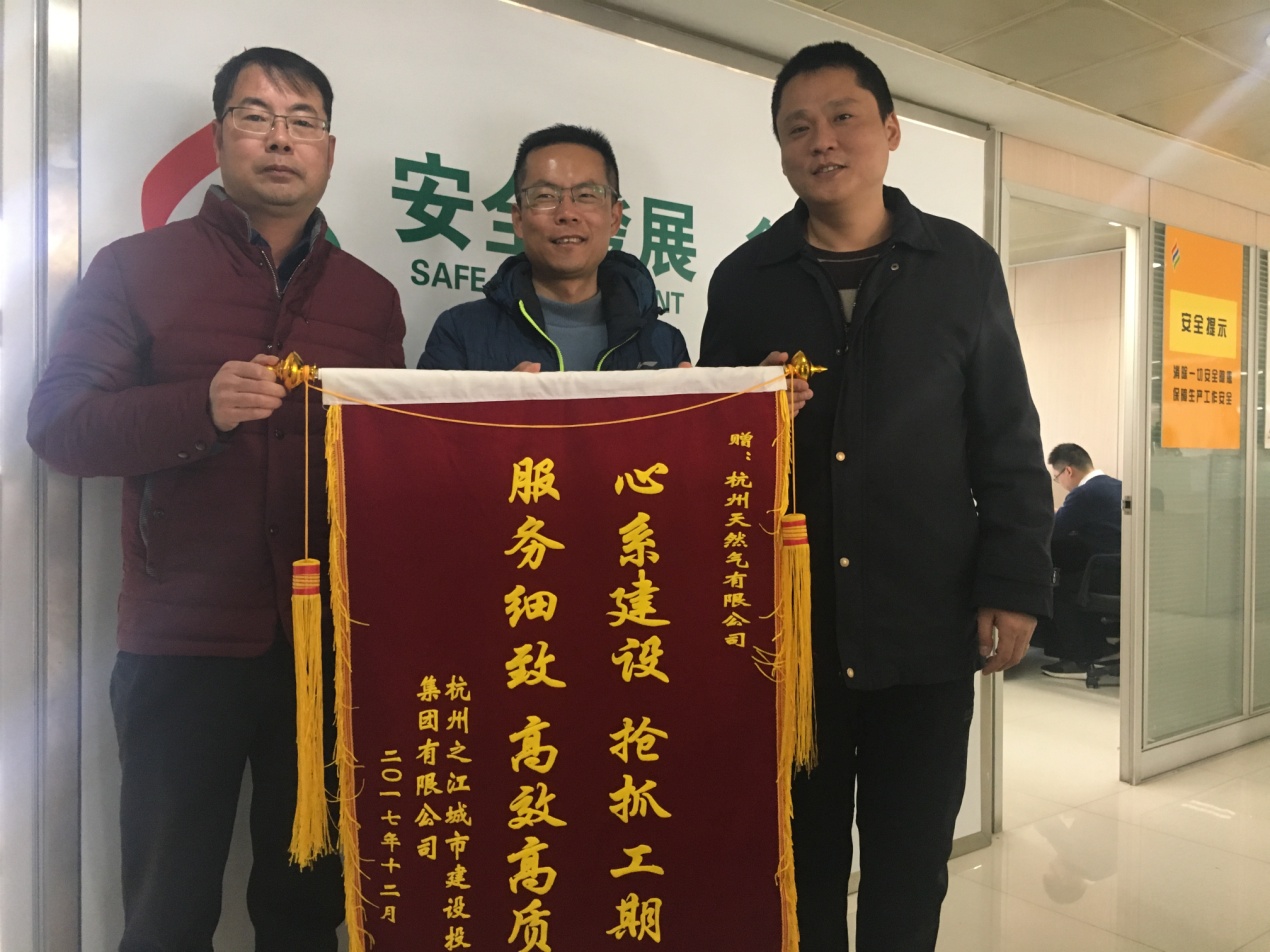2月2日下午,杭州之江城市建设投资集团有限公司负责人给管网输配分公司竺恩惠、富君、钱峰等九人送来一张张写有“2017热情服务,为客解忧先进个人”的荣誉证书;2月8日上午,该公司代表再次来到七堡,送上一面写有“心系建设抢抓工期 服务细致 高效高质”的锦旗,感谢分公司的密切配合和鼎力相助。