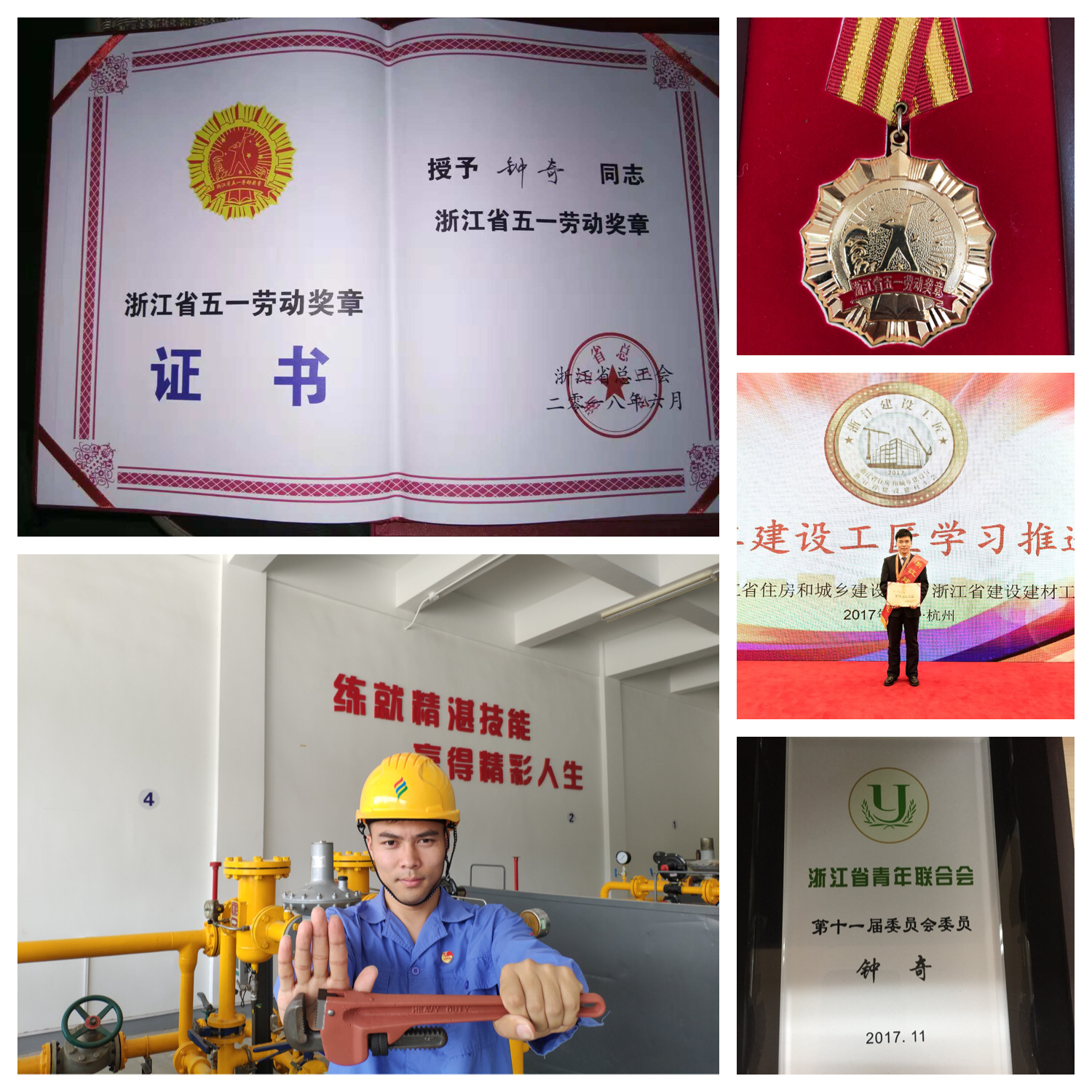 钟奇,2012年入职,现为杭天管网输配分公司管网运行科工艺技术员,中共预备党员。作为新一代知识型技能人才,他虚心求教,刻苦钻研,将专业技术知识与处理实际工作完美结合,迅速成长为独挡一面的技术能手,先后获得“全国住房城乡建设行业技术能手”、“浙江省技术能手”、“浙江建设工匠”、“浙江金蓝领”等荣誉称号,并于2017年被选拔为浙江省青年联合委员会委员。