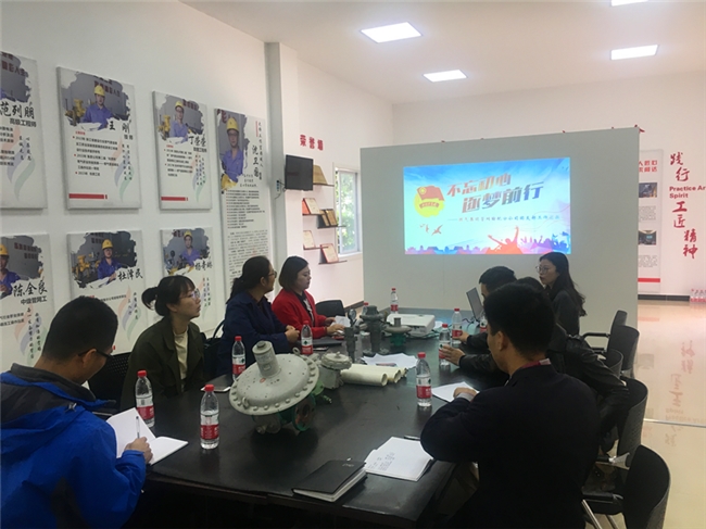调研组一行在分公司团支部副书记钟奇的引导下,参观了杭天七堡基地的燃气三联供系统、青年职工之家和调压大师工作室,认真听取了分公司团支部书记陶婧从组织建设、重点工作、成绩荣誉、计划展望四个方面作的基层团组织工作汇报。