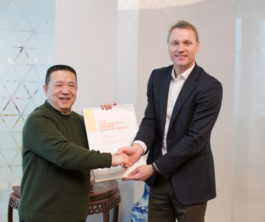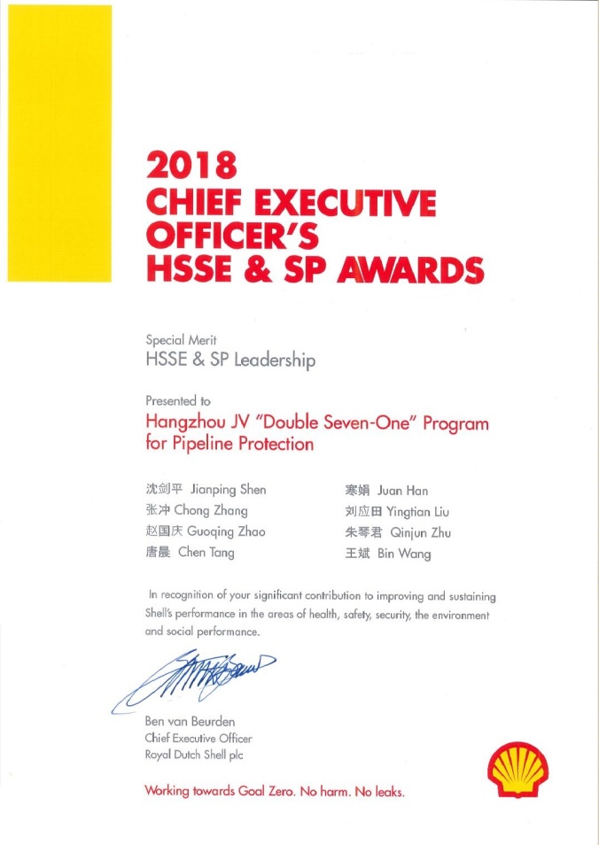 壳牌CEO’s HSSE & SP奖已持续举办12年,每年在壳牌全球所有业务范围内开展。2018年全球共有246个项目提名参选,“双七个一”管理项目脱颖而出,位列全球前五喜获殊荣,同时更是壳牌中国区域内所有业务板块中唯一获奖的项目。近日,壳牌亚太区天然气一体化副总裁As Templemen代表壳牌CEO范伯登向董事长芦俊颁发了荣誉证书。