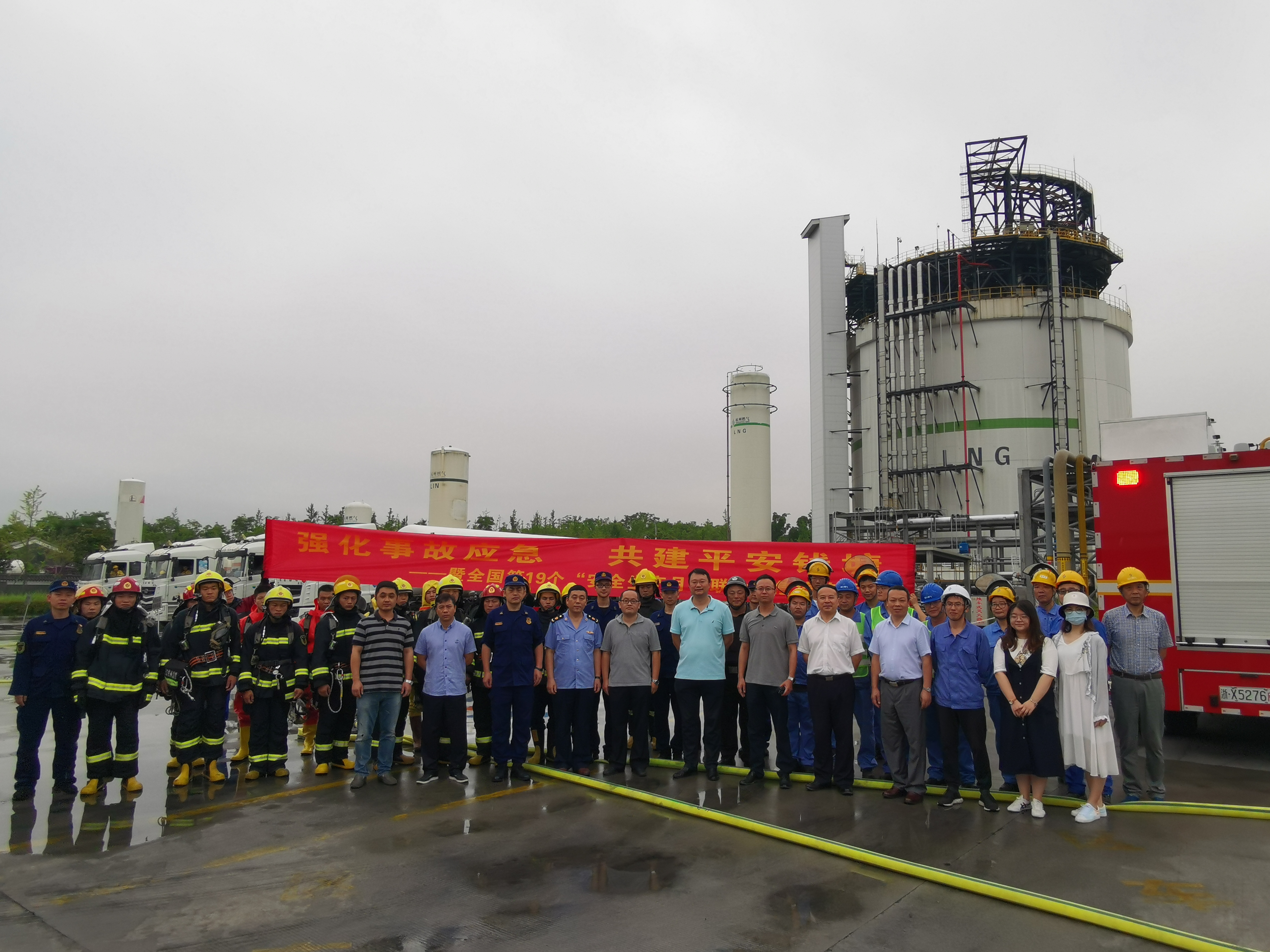 2020年6月是全国第19个安全生产月,为吸取“6.13浙江温岭槽罐车爆炸事故”经验教训,围绕“消除事故隐患,筑牢安全防线”活动主题, 6月24日,杭天高压储配分公司、杭州钱江燃气有限公司联合杭州钱塘新区消防救援大队在东部LNG应急气源站开展了“强化事故应急,共建平安钱塘”——暨全国第19个“安全生产月”联合应急演练。杭州市市场监管局特检处副处长李文炜,钱塘市场监管分局副局长朱信贞,钱塘新区消防大队教导员万峰,杭天副总经理郑基鹏受邀观摩指导。