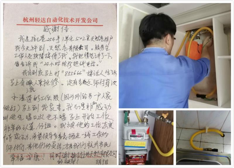 匠行见精神,沈坚负责的工作态度令用户深受感动,8月10日一早就送来了表扬信表示了自己的感激之情。信中写到:我被他的工作态度所感动,希望领导多多表扬在一线工作的师傅们,同时也感谢杭州天然气有限公司的领导。用户的赞扬便是对我们工作的肯定,服务发展公司仍将不忘初心、牢记使命,践行“为城为民”的服务理念,用有温度的服务让每位燃气用户享受品质绿色生活。