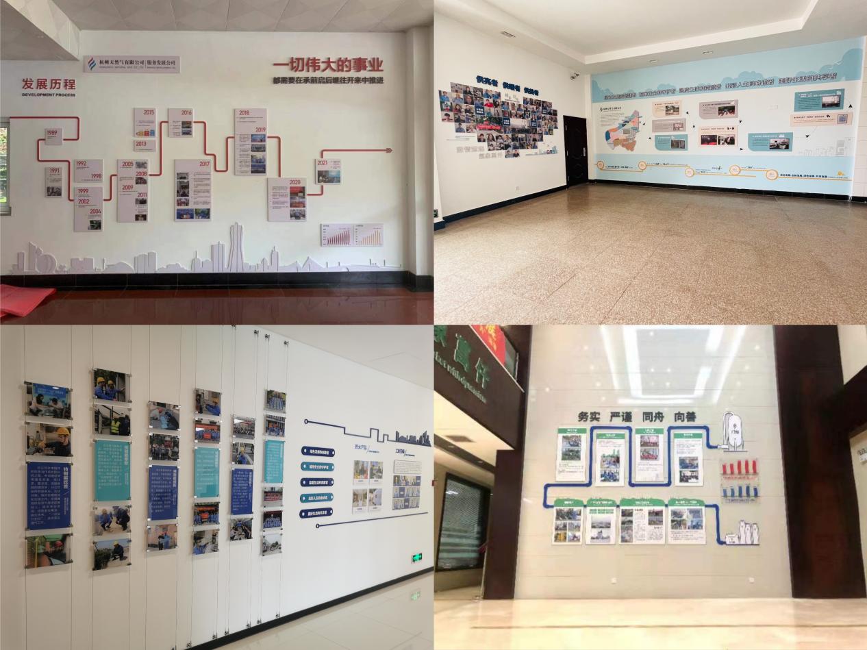 杭天服务发展公司文化墙设立在北大桥办公楼一楼,由发展历程和杭服人物两块内容组成,生动展示服务发展公司的“前世今生”及发展过程中涌现出来的诸多优秀的银河 人。管网输配分公司文化墙直观展现分公司“六个特别”精神,展现分公司劳模工匠精神、企业历程、管网规模、组织架构和未来展望,并与一楼已经建成的大师工作室、一站式服务基地相呼应,全方位展示分公司的特色、亮点。高压储配分公司文化墙设置在东部LNG应急气源站,分左右两块墙面,左侧文化墙上部展示“杭州市域高压管网布局图”,右侧文化墙围绕分公司“四个之家”打造、四大产业经典案例等内容,将各专业线工作融入其中;滨江分公司“一墙”设于滨文路一楼大厅,整体定位国际滨,通过旅游导览图模式,讲述滨江大地上的燃气故事,同时结合全体员工笑脸融合团队墙,寓意企业如家的温暖。