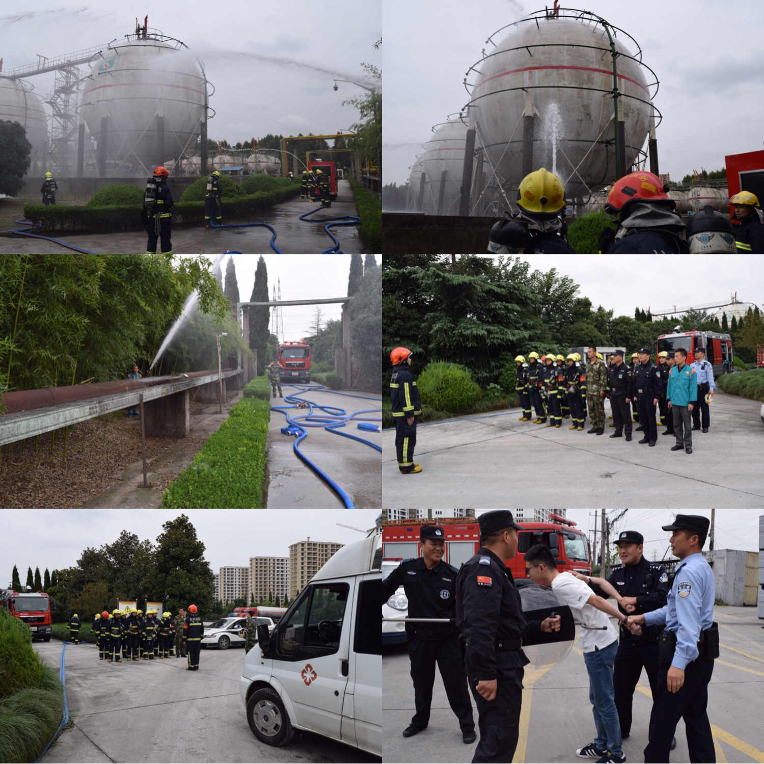 本次消防、反恐演习模拟了C号球罐着火和外来人员闯入的应急处置。接到报警后七堡、九堡消防中队驾驶消防车赶到现场,随后公安和社区微型消防车、救护车也相继赶到。消防队员听从指挥,有序快速铺开水带进行出水灭火,百江志愿消防队同时配合打开消防水泵,控制消防水炮进行灭火;东郊厂安保人员配合公安人员对外来闯入人员进行控制。演习结束,所有参与者列队聆听消防队长讲解灭火注意事项和分享消防方面的知识;彭埠派出所人员对反恐应急处置进行了指导。