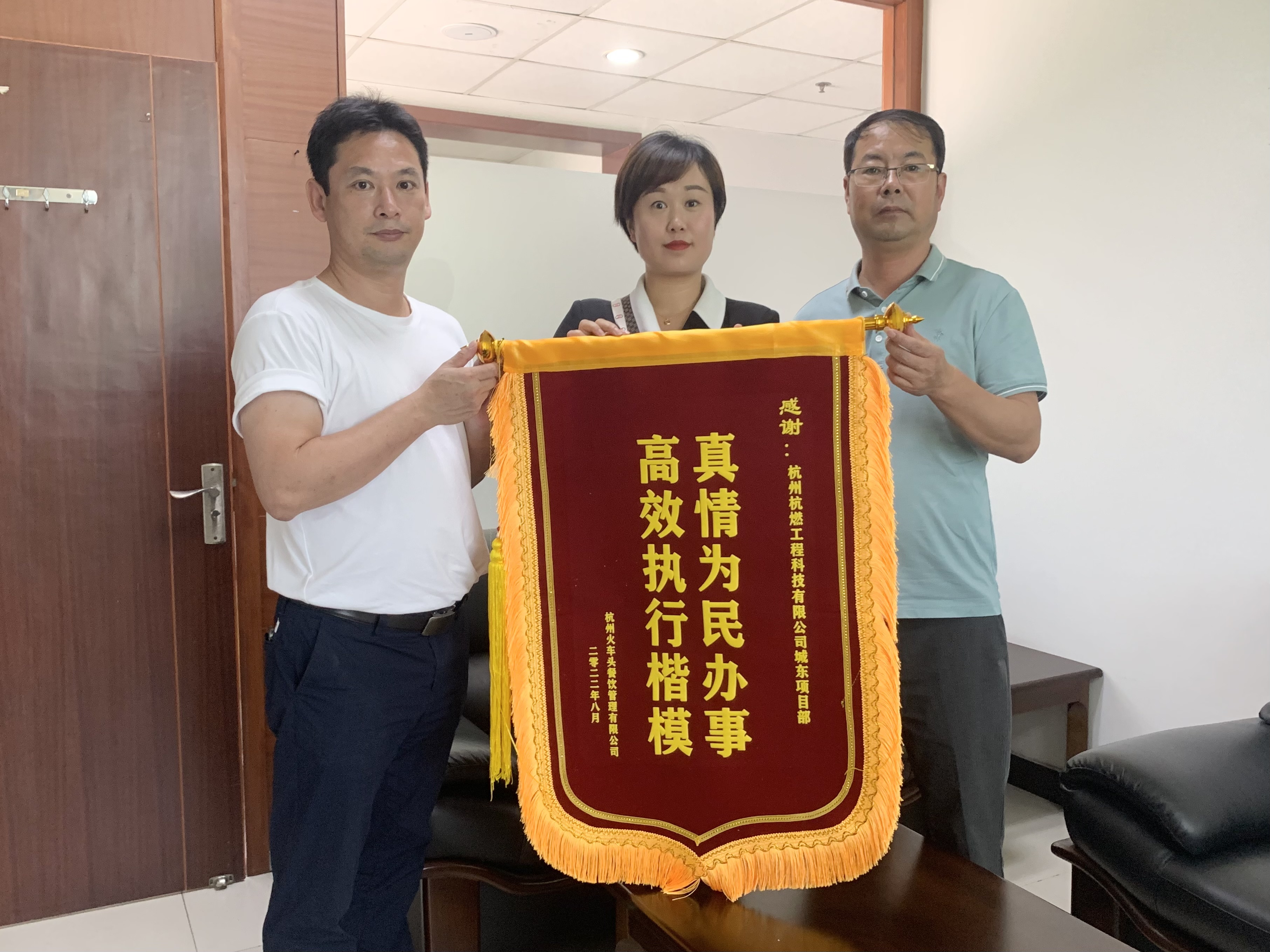 8月8日下午,杭州火车头餐饮管理有限公司副总经理吴延伟、杭州乾园高级餐厅白塔公园店店长张凤专程来到工程科技公司,送上锦旗“真情为民办事,高效执行楷模”,对公司城东项目部的施工服务表示感谢,副总经理竺恩惠代表公司感谢用户对我们工作的支持和肯定。