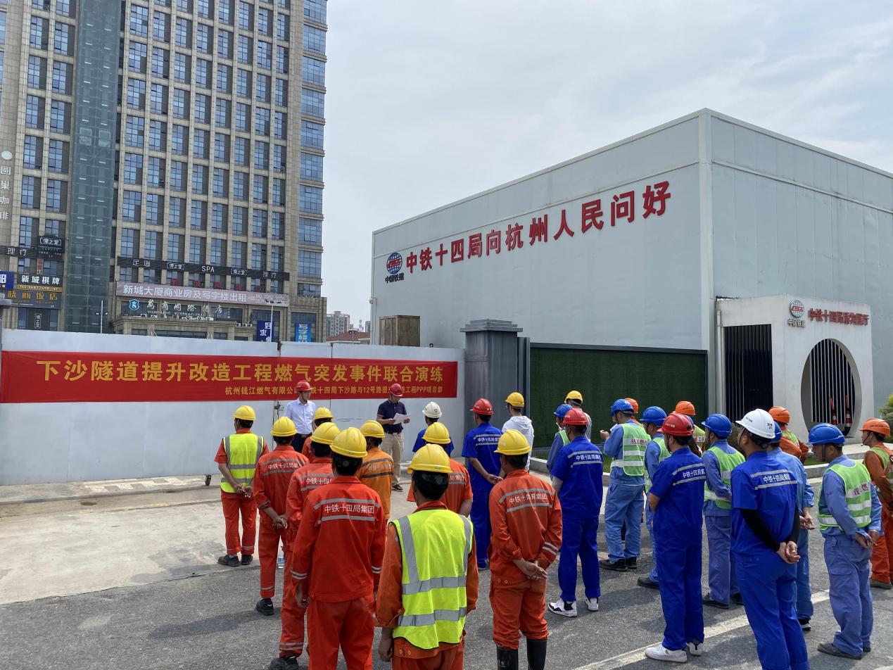 演练模拟下沙隧道提升改造工程下沙路转12号路采用盾构施工作业,983号阀门(DN400)膨胀节因盾构推进过程中引起的土壤扰动而开裂,造成燃气泄漏,影响景园南区用户用气。13点35分,现场指挥部下达演练开始指令,中铁十四局工作人员发现燃气井异响并将情况告知钱江公司现场监护人员,随后监护人员将情况反映给抢修人员并立即赶到现场。查明情况后,上报公司热线中心。热线中心告知公司领导并启动应急预案。同时,监护人员在中铁十四局人员配合下拉好警戒,做好人员疏散及交通引导等处置工作。抢修人员及工程公司支援力量到达现场进行修复工作。经过20分钟紧急处置,险情被排除,现场恢复供气,演练结束。