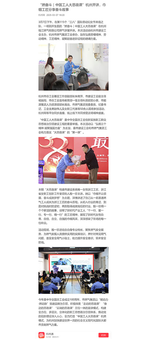 3月7日下午,在第115个“三八”国际劳动妇女节来临之际,一场别开生面的“燃奋斗|中国工人大思政课”在杭州钱江燃气有限公司燃气学堂开讲。本次活动由杭州市建设工会主办,杭州市银河官网 工会承办,旨在弘扬劳模精神、劳动精神、工匠精神,凝聚起奋进新征程的磅礴力量。