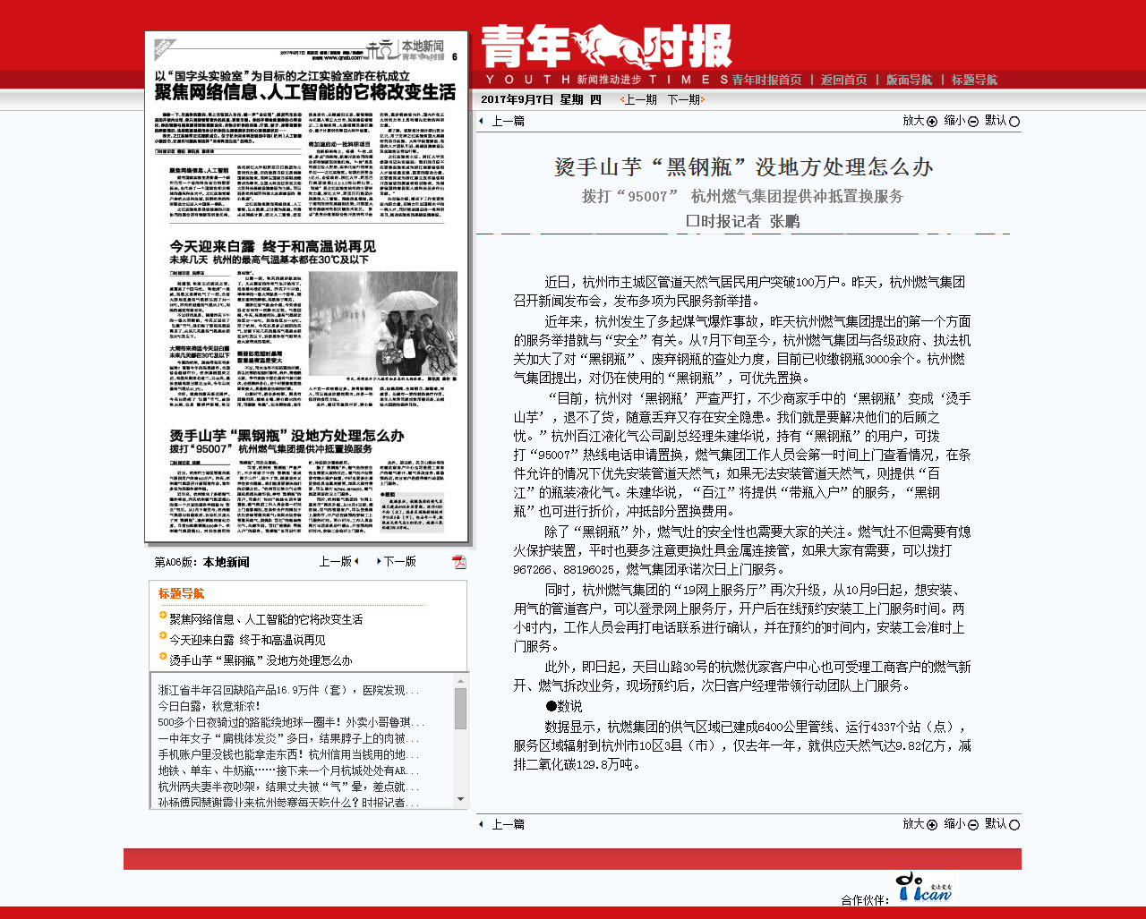 近年来,杭州发生了多起煤气爆炸事故,昨天银河官网 集团提出的第一个方面的服务举措就与“安全”有关。从7月下旬至今,银河官网 集团与各级政府、执法机关加大了对“黑钢瓶”、废弃钢瓶的查处力度,目前已收缴钢瓶3000余个。银河官网 集团提出,对仍在使用的“黑钢瓶”,可优先置换。