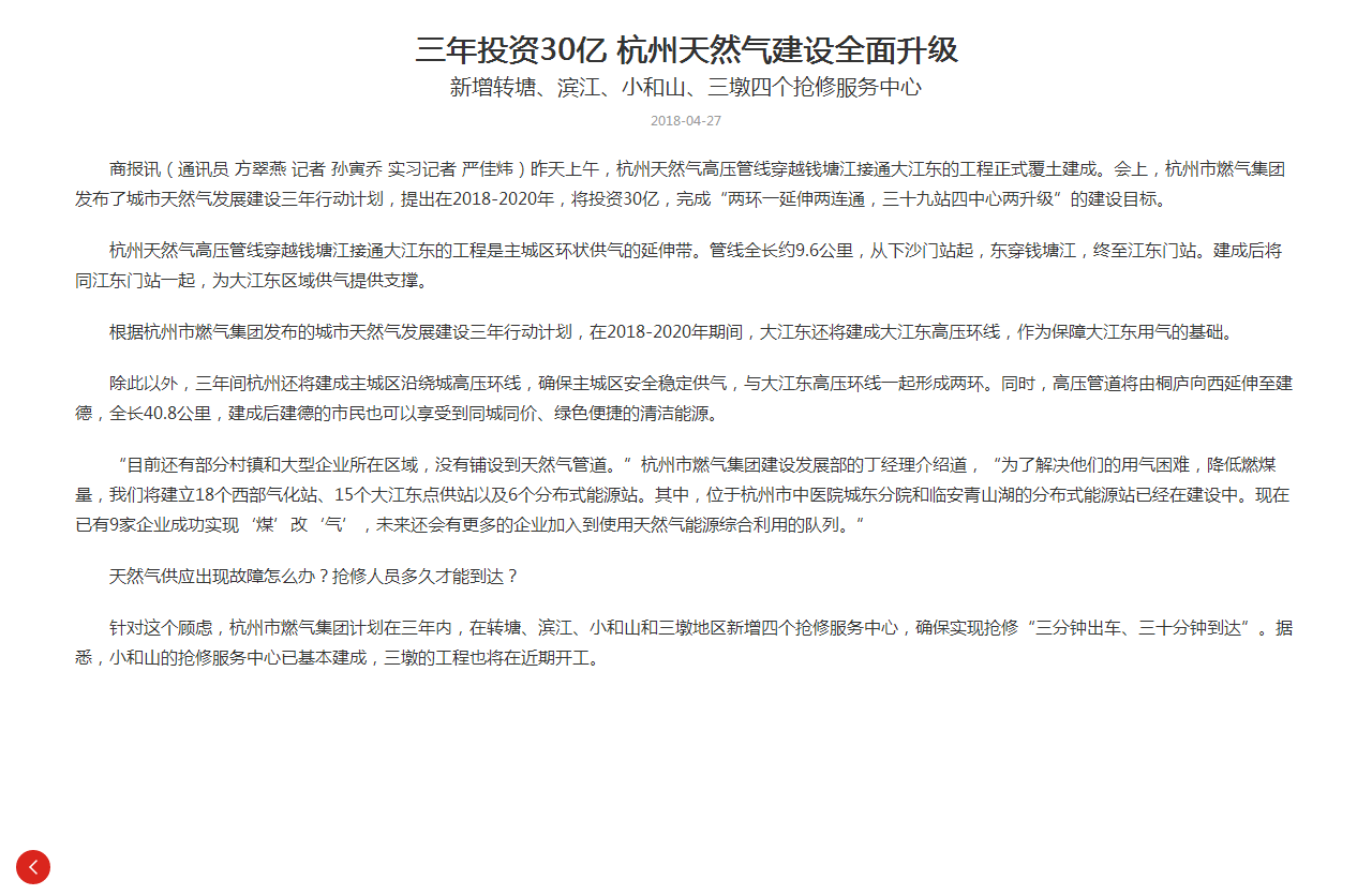 发布了城市天然气发展建设三年行动计划,提出在2018-2020年,将投资30亿,完成“两环一延伸两连通,三十九站四中心两升级”的建设目标。