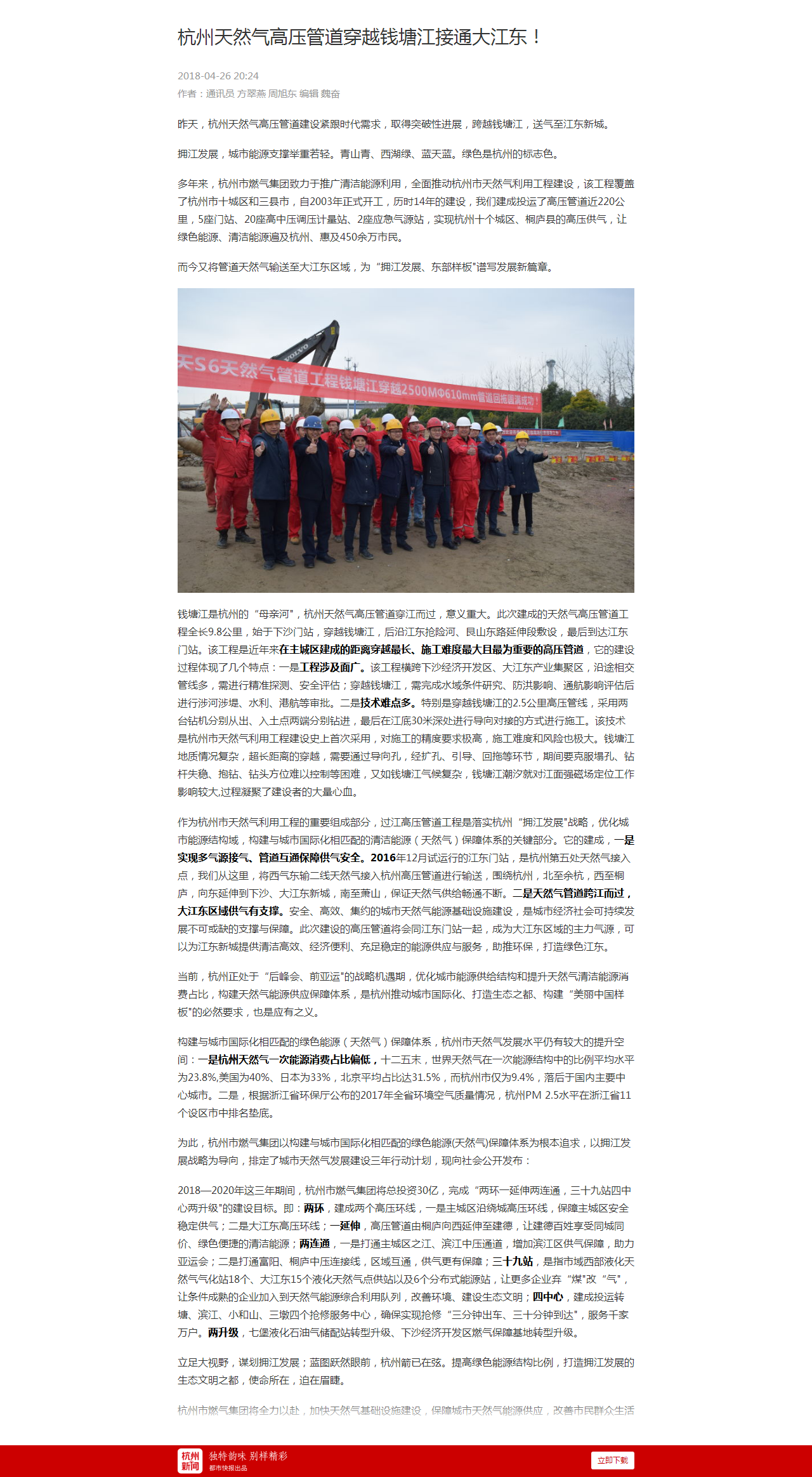 昨天,杭州天然气高压管道建设紧跟时代需求,取得突破性进展,跨越钱塘江,送气至江东新城。