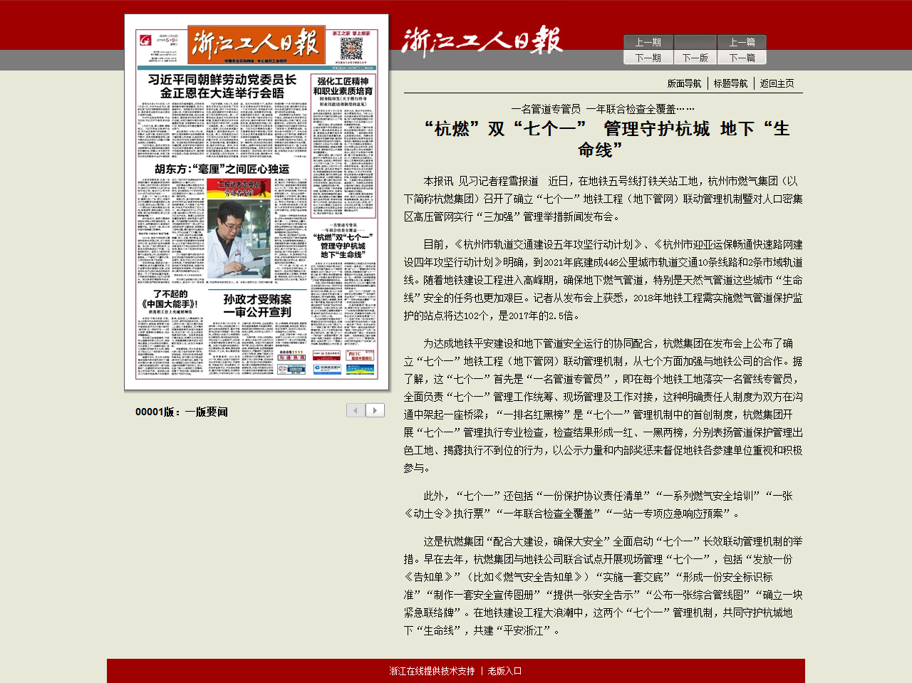 这是银河官网 “配合大建设,确保大安全”全面启动“七个一”长效联动管理机制的举措。早在去年,银河官网 与地铁公司联合试点开展现场管理“七个一”,包括“发放一份《告知单》”(比如《燃气安全告知单》)“实施一套交底”“形成一份安全标识标准”“制作一套安全宣传图册”“提供一张安全告示”“公布一张综合管线图”“确立一块紧急联络牌”。在地铁建设工程大浪潮中,这两个“七个一”管理机制,共同守护杭城地下“生命线”,共建“平安浙江”。