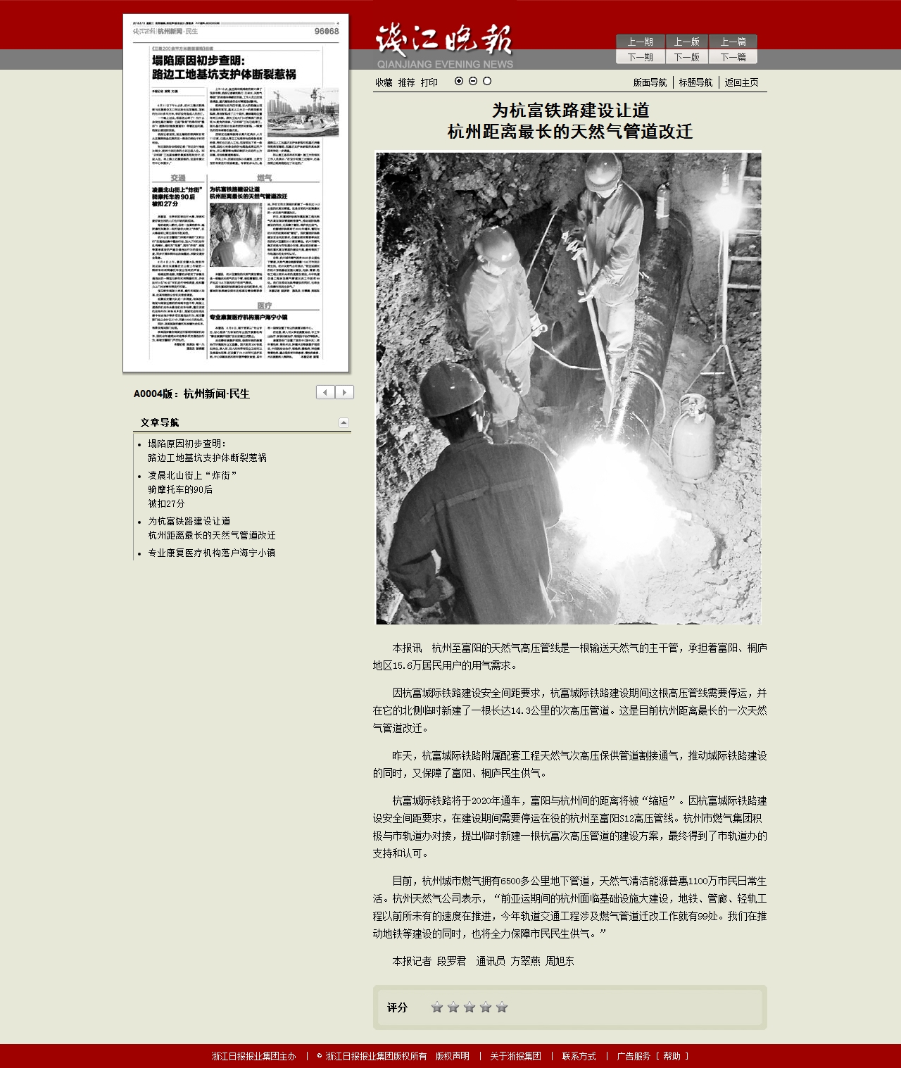 因杭富城际铁路建设安全间距要求,杭富城际铁路建设期间这根高压管线需要停运,并在它的北侧临时新建了一根长达14.3公里的次高压管道。这是目前杭州距离最长的一次天然气管道改迁。