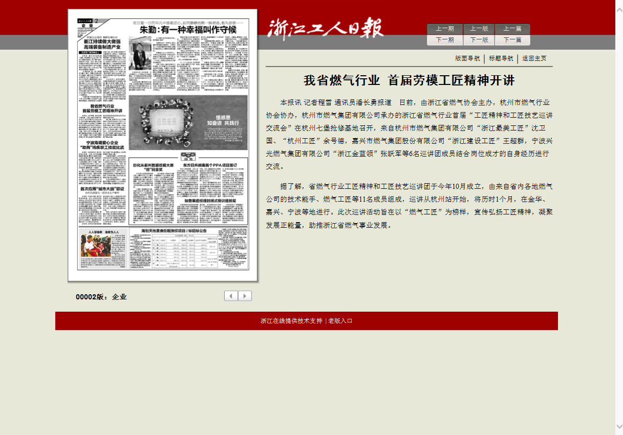 本报讯 记者程雪 通讯员潘长勇报道 日前,由浙江省燃气协会主办,杭州市燃气行业协会协办,杭州市银河官网 有限公司承办的浙江省燃气行业首届“工匠精神和工匠技艺巡讲交流会”在杭州七堡抢修基地召开,来自杭州市银河官网 有限公司“浙江最美工匠”沈卫国、“杭州工匠”余号德,嘉兴市银河官网 股份有限公司“浙江建设工匠”王超群,宁波兴光银河官网 有限公司“浙江金蓝领”张跃军等6名巡讲团成员结合岗位成才的自身经历进行交流。