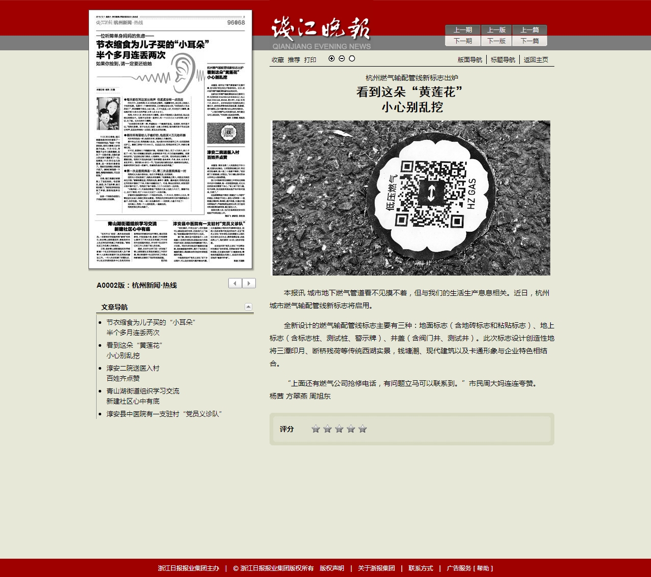 本报讯 城市地下燃气管道看不见摸不着,但与我们的生活生产息息相关。近日,杭州城市燃气输配管线新标志将启用。