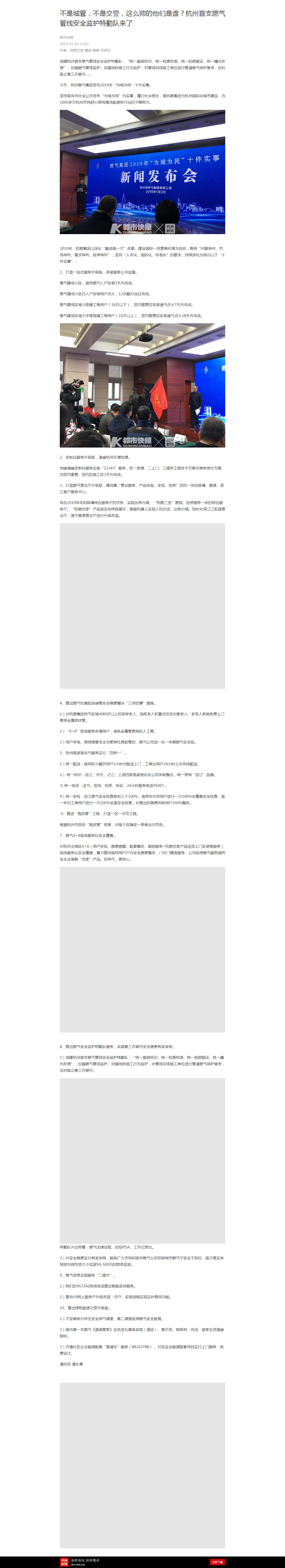 组建杭州首支燃气管线安全监护特勤队,“统一服装标识、统一检查标准、统一拍照留证、统一曝光反馈”,加强燃气管线监护、加强地铁施工行为监护,对管线沿线施工单位进行管道燃气保护宣传,及时阻止第三方破坏……