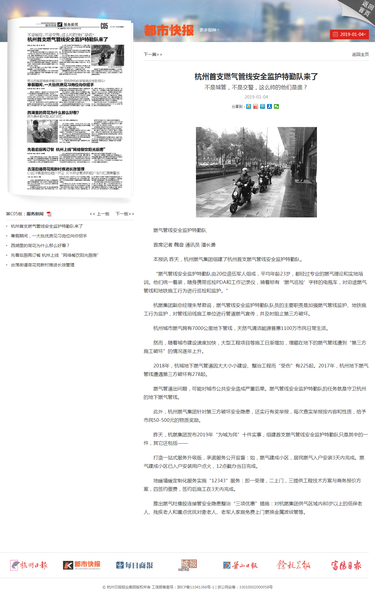 “燃气管线安全监护特勤队由20位退伍军人组成,平均年龄23岁,都经过专业的燃气理论和实地培训。他们统一着装,随身携带巡检PDA和工作记录仪,骑着标有‘燃气巡检’字样的电瓶车,对沿途燃气管线和地铁施工行为进行巡检和监护。”
