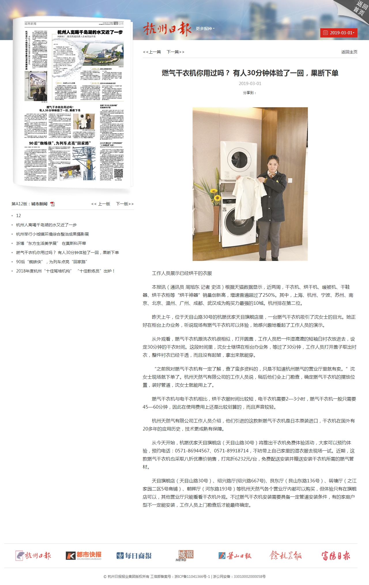 昨天上午,位于天目山路30号的银河 优家天目旗舰店里,一台燃气干衣机吸引了沈女士的目光。她正好在柜台上办业务,听说现场有燃气干衣机可以体验,她感兴趣地看起了工作人员的演示。