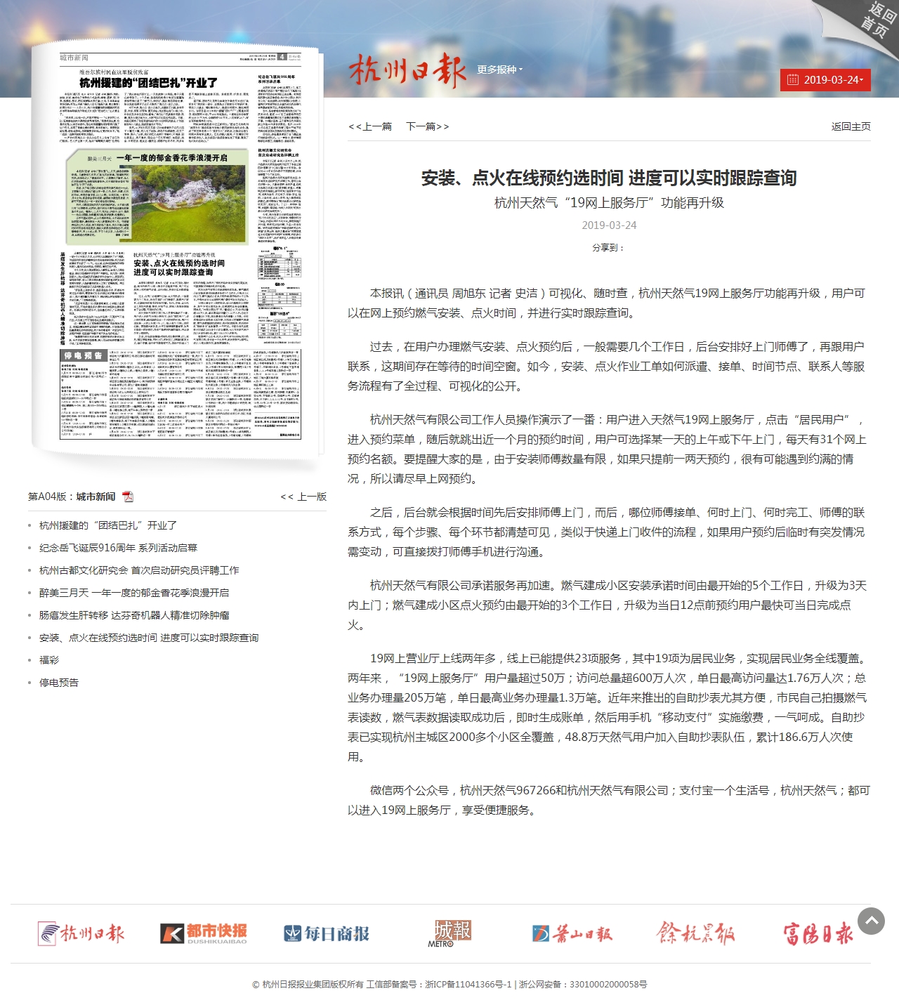 本报讯(通讯员 周旭东 记者 史洁)可视化、随时查,杭州天然气19网上服务厅功能再升级,用户可以在网上预约燃气安装、点火时间,并进行实时跟踪查询。