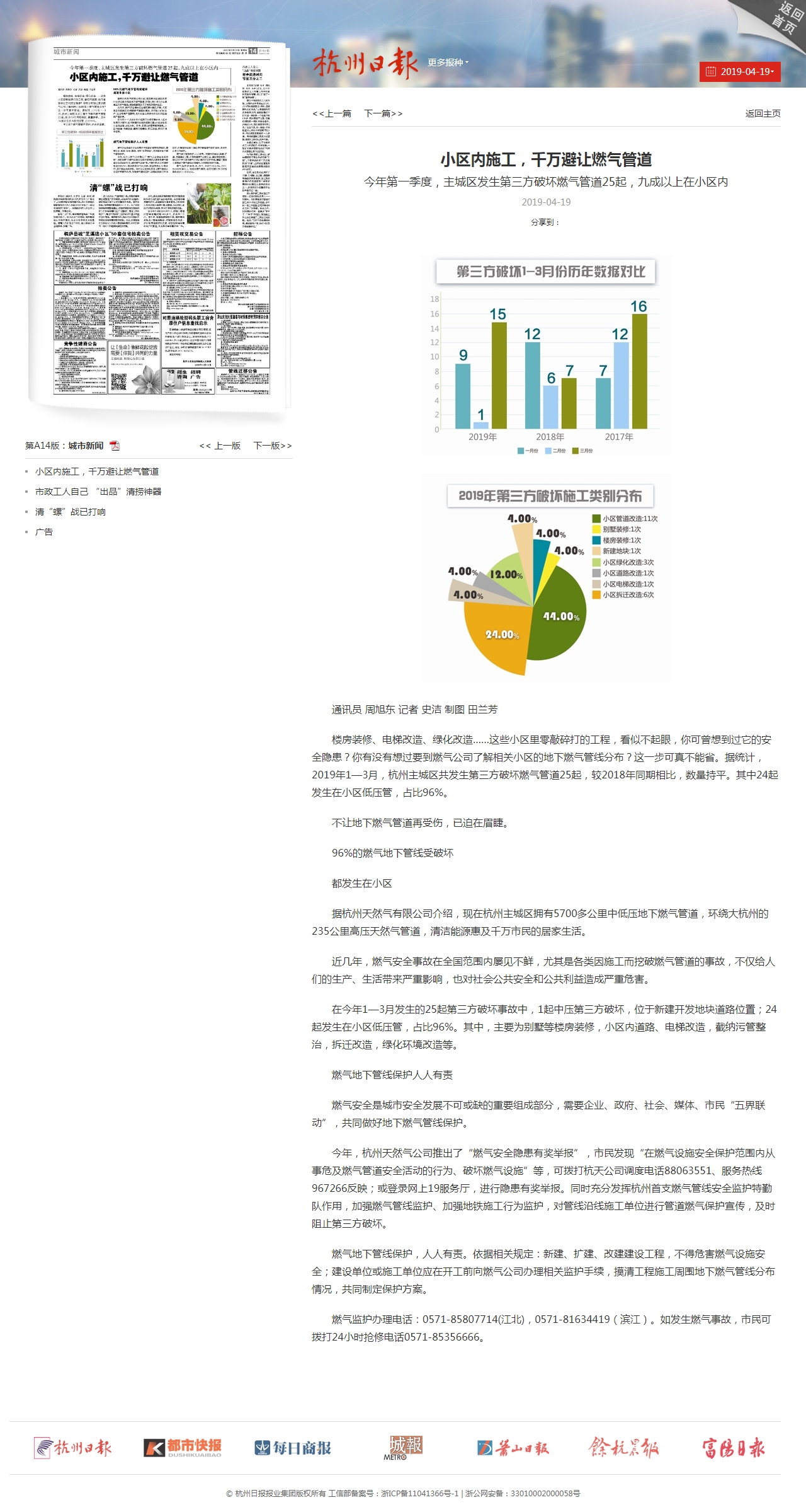 楼房装修、电梯改造、绿化改造……这些小区里零敲碎打的工程,看似不起眼,你可曾想到过它的安全隐患?你有没有想过要到燃气公司了解相关小区的地下燃气管线分布?这一步可真不能省。据统计,2019年1—3月,杭州主城区共发生第三方破坏燃气管道25起,较2018年同期相比,数量持平。其中24起发生在小区低压管,占比96%。