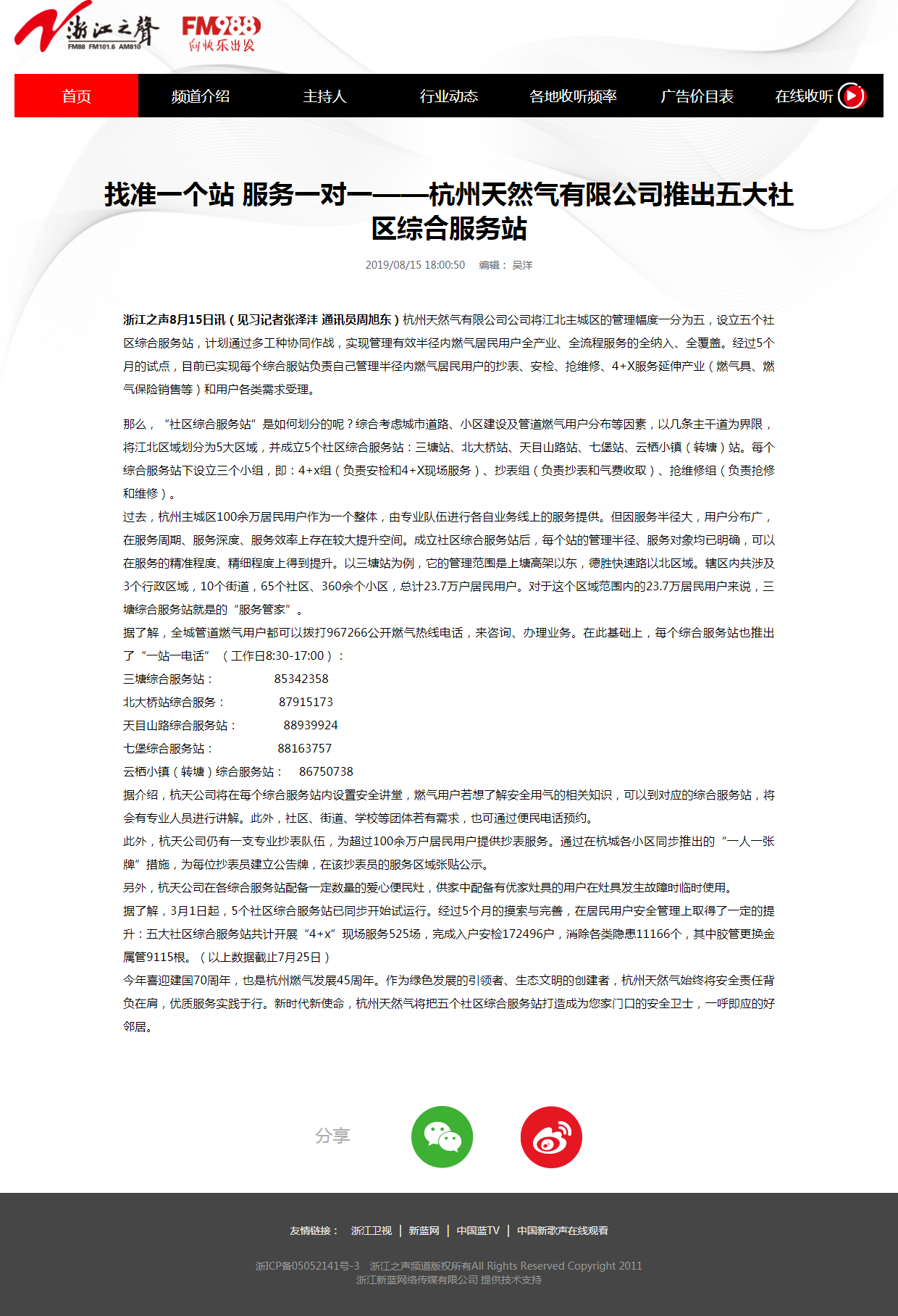 浙江之声8月15日讯(见习记者张泽沣 通讯员周旭东)杭州天然气有限公司公司将江北主城区的管理幅度一分为五,设立五个社区综合服务站,计划通过多工种协同作战,实现管理有效半径内燃气居民用户全产业、全流程服务的全纳入、全覆盖。经过5个月的试点,目前已实现每个综合服站负责自己管理半径内燃气居民用户的抄表、安检、抢维修、4+X服务延伸产业(燃气具、燃气保险销售等)和用户各类需求受理。