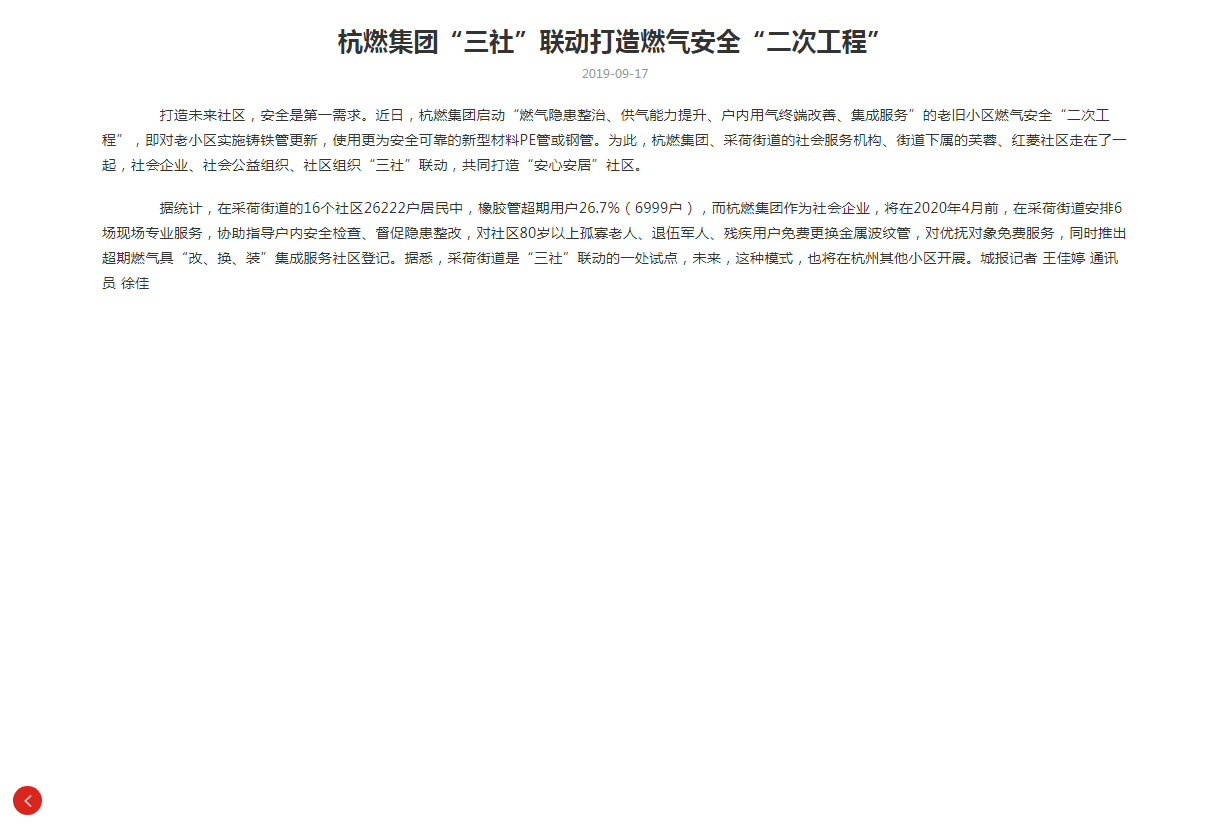 打造未来社区,安全是第一需求。近日,银河官网 启动“燃气隐患整治、供气能力提升、户内用气终端改善、集成服务”的老旧小区燃气安全“二次工程”,即对老小区实施铸铁管更新,使用更为安全可靠的新型材料PE管或钢管。为此,银河官网 、采荷街道的社会服务机构、街道下属的芙蓉、红菱社区走在了一起,社会企业、社会公益组织、社区组织“三社”联动,共同打造“安心安居”社区。