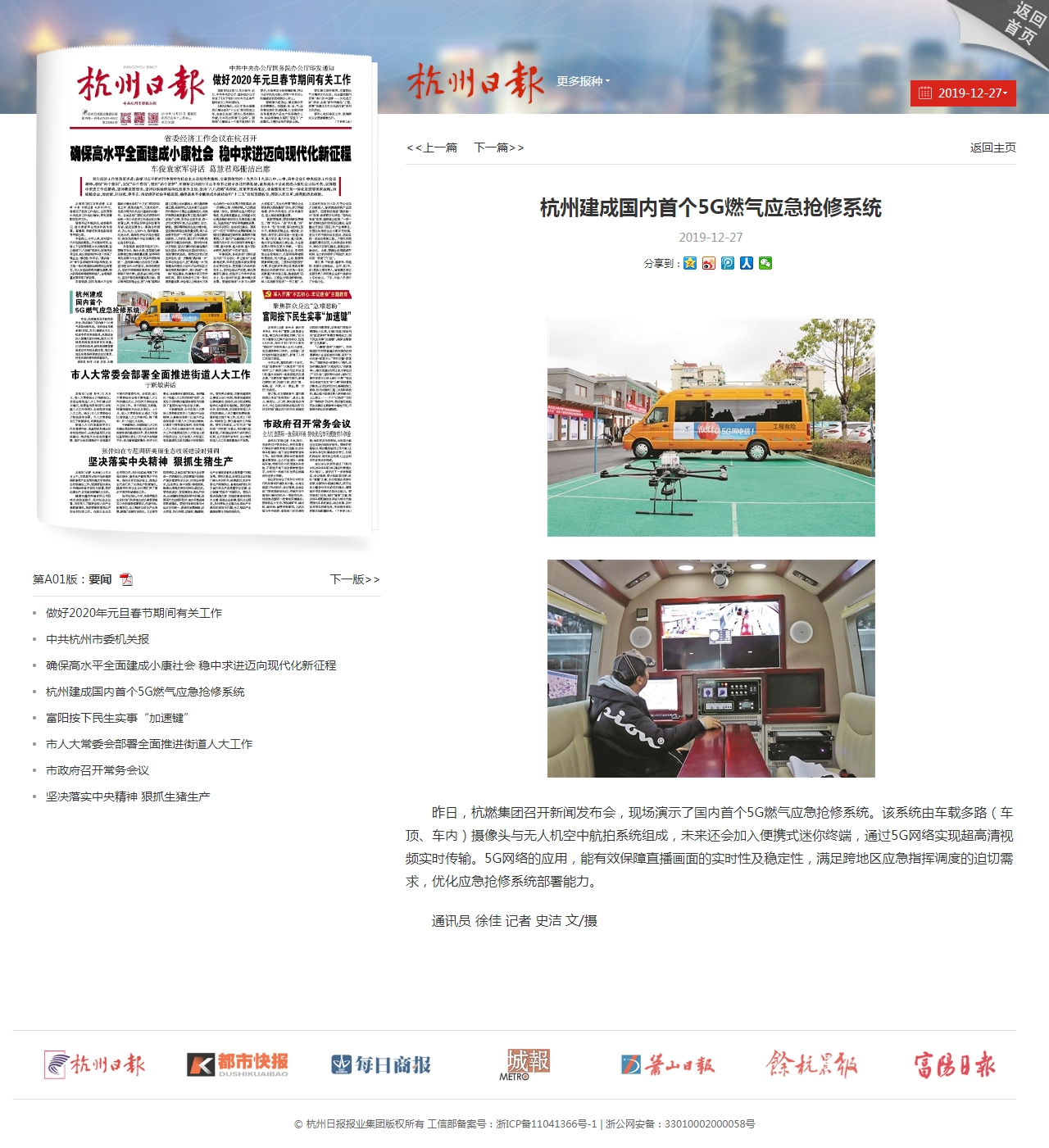 【杭州日报】杭州建成国内首个5G燃气应急抢修系统