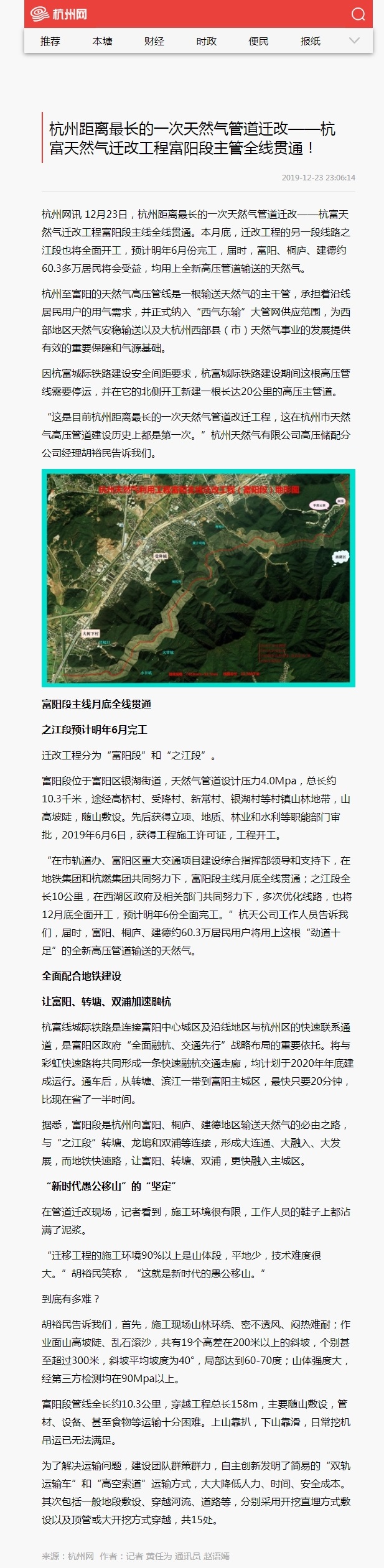 “在市轨道办、富阳区重大交通项目建设综合指挥部领导和支持下,在地铁集团和银河官网 共同努力下,富阳段主线月底全线贯通;之江段全长10公里,在西湖区政府及相关部门共同努力下,多次优化线路,也将12月底全面开工,预计明年6份全面完工。”杭天公司工作人员告诉我们,届时,富阳、桐庐、建德约60.3万居民用户将用上这根“劲道十足”的全新高压管道输送的天然气。