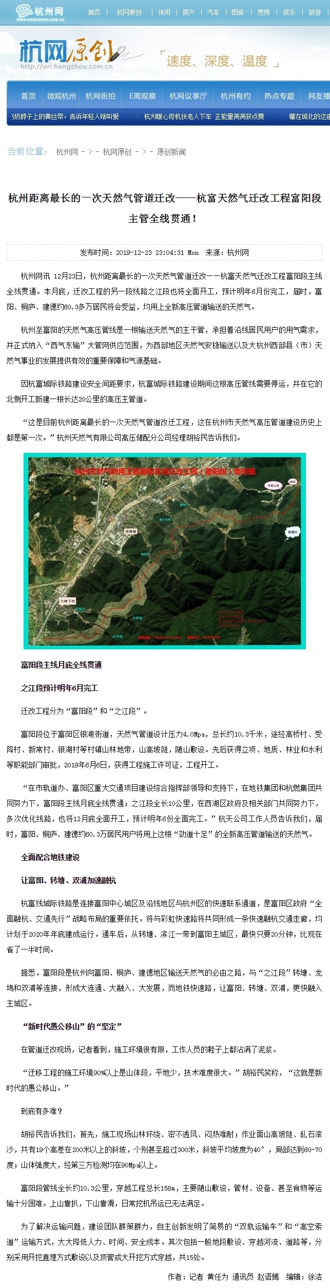 杭州网讯 12月23日,杭州距离最长的一次天然气管道迁改——杭富天然气迁改工程富阳段主线全线贯通。本月底,迁改工程的另一段线路之江段也将全面开工,预计明年6月份完工,届时,富阳、桐庐、建德约60.3多万居民将会受益,均用上全新高压管道输送的天然气。