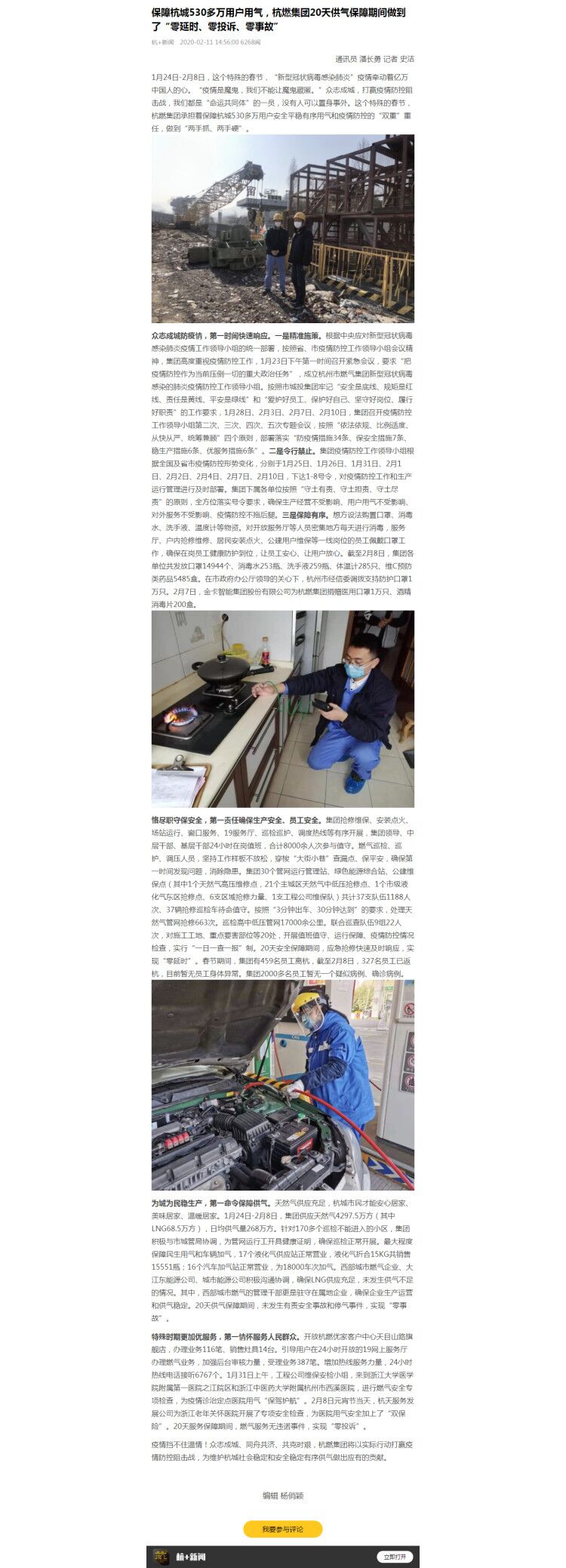 为城为民稳生产,第一命令保障供气。天然气供应充足,杭城市民才能安心居家、美味居家、温暖居家。1月24日-2月8日,集团供应天然气4297.5万方(其中LNG68.5万方),日均供气量268万方。针对170多个巡检不能进入的小区,集团积极与市城管局协调,为管网运行工开具健康证明,确保巡检正常开展。最大程度保障民生用气和车辆加气,17个液化气供应站正常营业,液化气折合15KG共销售15551瓶;16个汽车加气站正常营业,为18000车次加气。西部城市燃气企业、大江东能源公司、城市能源公司积极沟通协调,确保LNG供应充足,未发生供气不足的情况。其中,西部城市燃气的管理干部更是驻守在属地企业,确保企业生产运营和供气稳定。20天供气保障期间,未发生有责安全事故和停气事件,实现“零事故”。