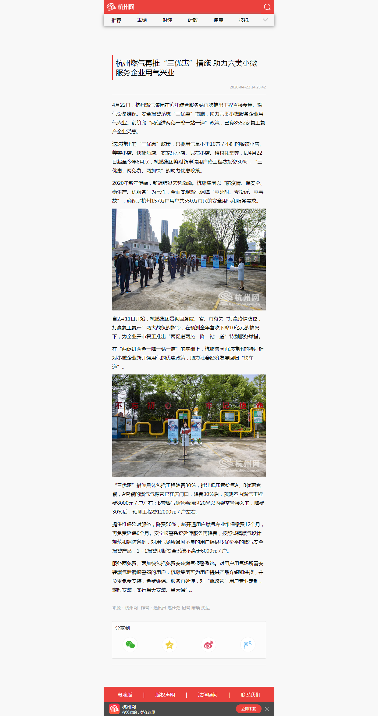 4月22日,银河官网 集团在滨江综合服务站再次推出工程直接费用、燃气设备维保、安全报警系统“三优惠”措施,助力六类小微服务企业用气兴业。前阶段“两促进两免一降一站一道”政策,已有8552家复工复产企业受惠。