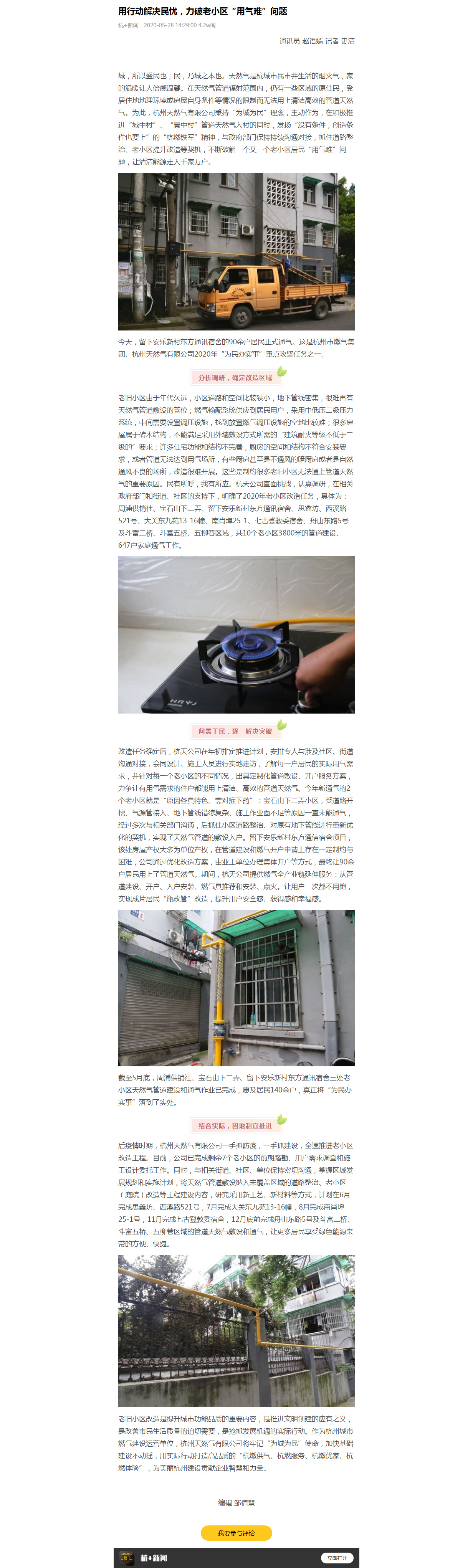 老旧小区改造是提升城市功能品质的重要内容,是推进文明创建的应有之义,是改善市民生活质量的迫切需要,是抢抓发展机遇的实际行动。作为杭州城市燃气建设运营单位,杭州天然气有限公司将牢记“为城为民”使命,加快基础建设不动摇,用实际行动打造高品质的“银河 供气、银河 服务、银河 优家、银河 体验”,为美丽杭州建设贡献企业智慧和力量。