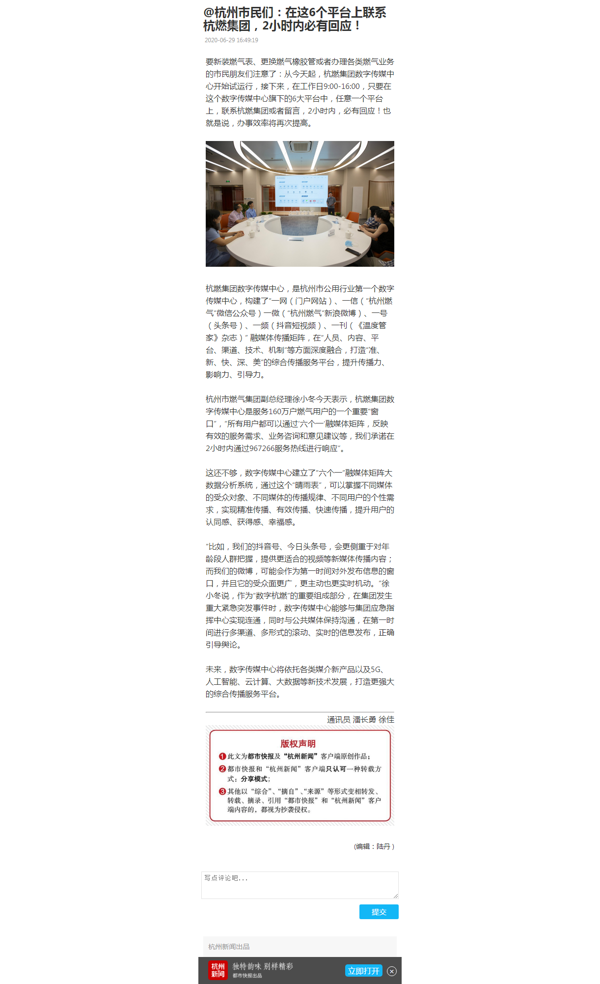 杭州市银河官网 副总经理徐小冬今天表示,银河官网 数字传媒中心是服务160万户燃气用户的一个重要“窗口”,“所有用户都可以通过‘六个一’融媒体矩阵,反映有效的服务需求、业务咨询和意见建议等,我们承诺在2小时内通过967266服务热线进行响应”。