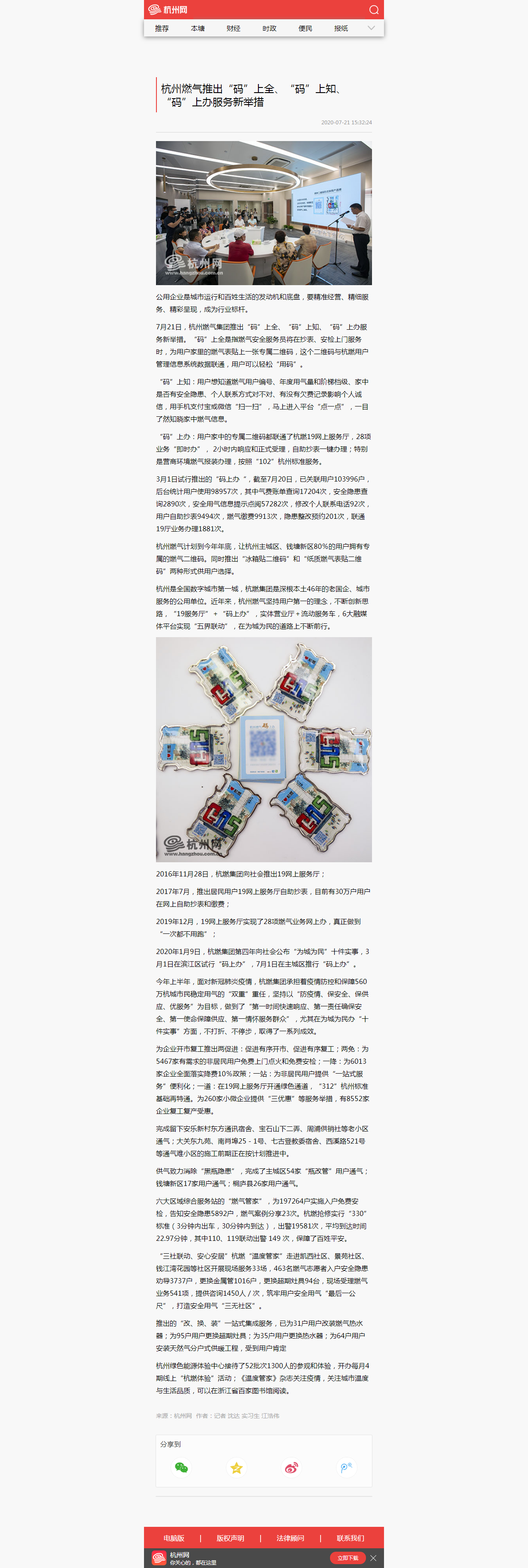 “码”上办:用户家中的专属二维码都联通了银河 19网上服务厅,28项业务“即时办”, 2小时内响应和正式受理,自助抄表一键办理;特别是营商环境燃气报装办理,按照“102”杭州标准服务。