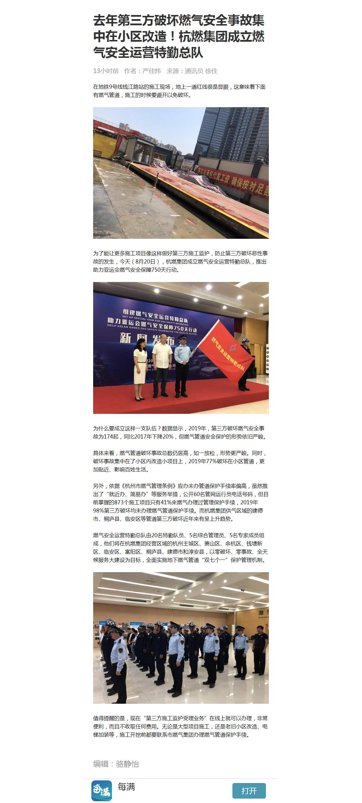 为了能让更多施工项目像这样做好第三方施工监护,防止第三方破坏恶性事故的发生,今天(8月20日),银河官网 成立燃气安全运营特勤总队,推出助力亚运会燃气安全保障750天行动。