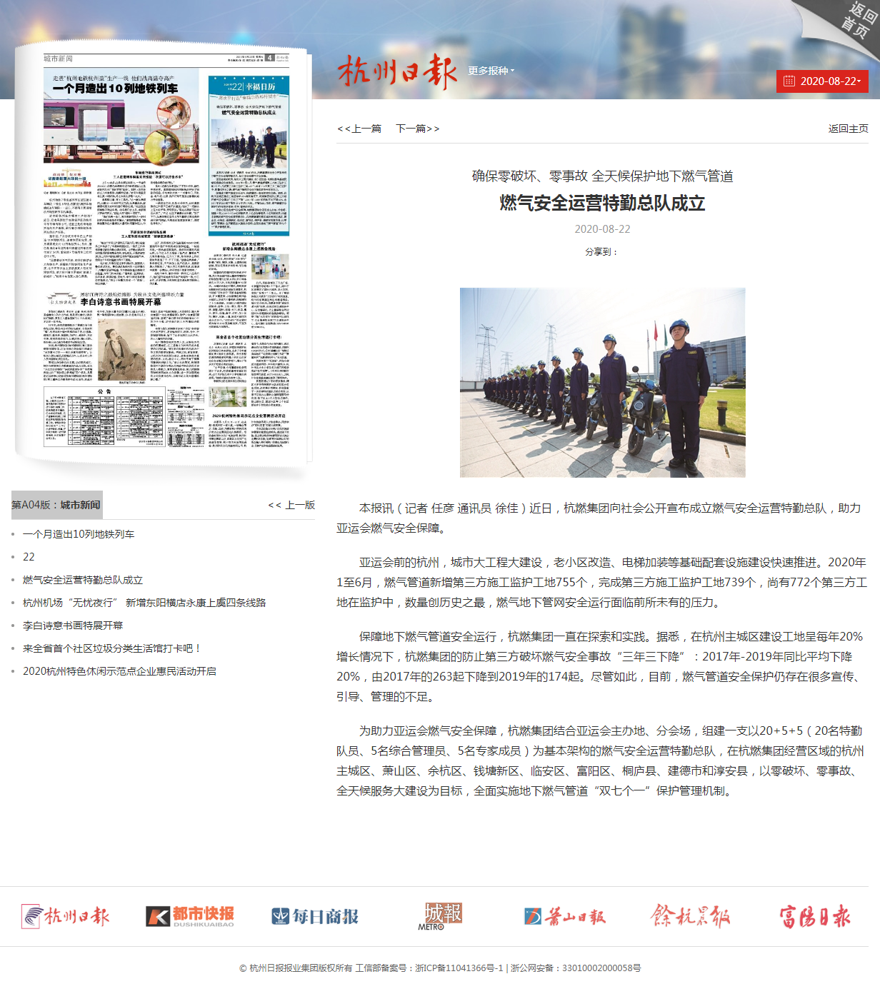 为助力亚运会燃气安全保障,银河官网 结合亚运会主办地、分会场,组建一支以20+5+5(20名特勤队员、5名综合管理员、5名专家成员)为基本架构的燃气安全运营特勤总队,在银河官网 经营区域的杭州主城区、萧山区、余杭区、钱塘新区、临安区、富阳区、桐庐县、建德市和淳安县,以零破坏、零事故、全天候服务大建设为目标,全面实施地下燃气管道“双七个一”保护管理机制。