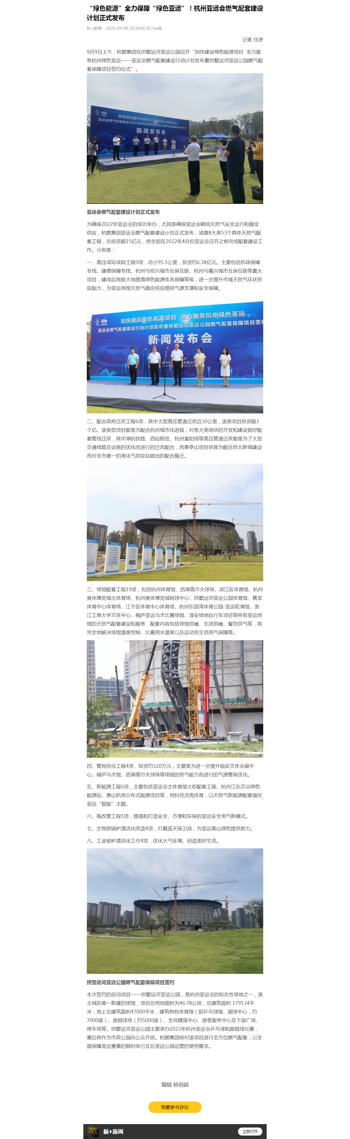 三、场馆配套工程19项,包括杭州体育馆、西湖高尔夫球场、滨江区体育馆、杭州奥体博览城主体育场、杭州奥体博览城网球中心、拱墅运河亚运公园体育馆、黄龙体育中心体育场、江干区体育中心体育场、杭州东部湾体育公园-亚运轮滑馆、浙江工商大学文体中心、桐庐亚运马术比赛场馆、淳安场地自行车项目等所有亚运场馆的天然气配套建设和服务,配套内容包括场馆供暖、生活供暖、餐饮供气等,将完全地解决场馆温度控制、比赛用水温度以及运动员生活用气保障等。
