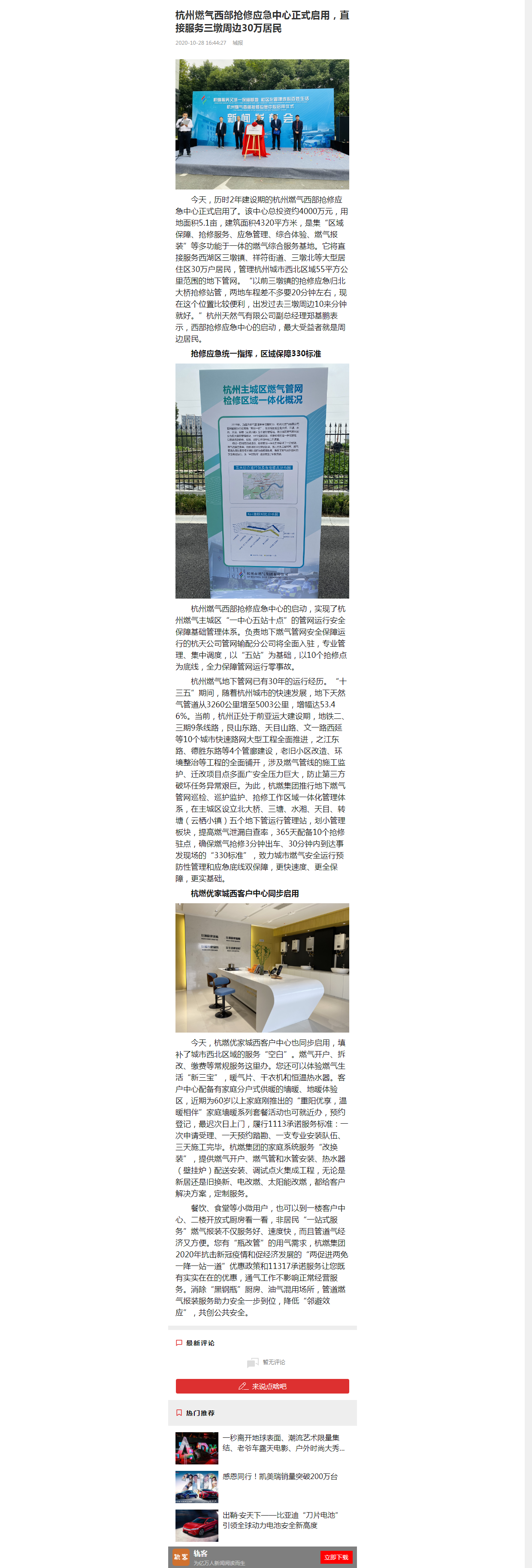 今天,历时2年建设期的银河官网 西部抢修应急中心正式启用了。该中心总投资约4000万元,用地面积5.1亩,建筑面积4320平方米,是集“区域保障、抢修服务、应急管理、综合体验、燃气报装”等多功能于一体的燃气综合服务基地。它将直接服务西湖区三墩镇、祥符街道、三墩北等大型居住区30万户居民,管理杭州城市西北区域55平方公里范围的地下管网。“以前三墩镇的抢修应急归北大桥抢修站管,两地车程差不多要20分钟左右,现在这个位置比较便利,出发过去三墩周边10来分钟就好。”杭州天然气有限公司副总经理郑基鹏表示,西部抢修应急中心的启动,最大受益者就是周边居民。