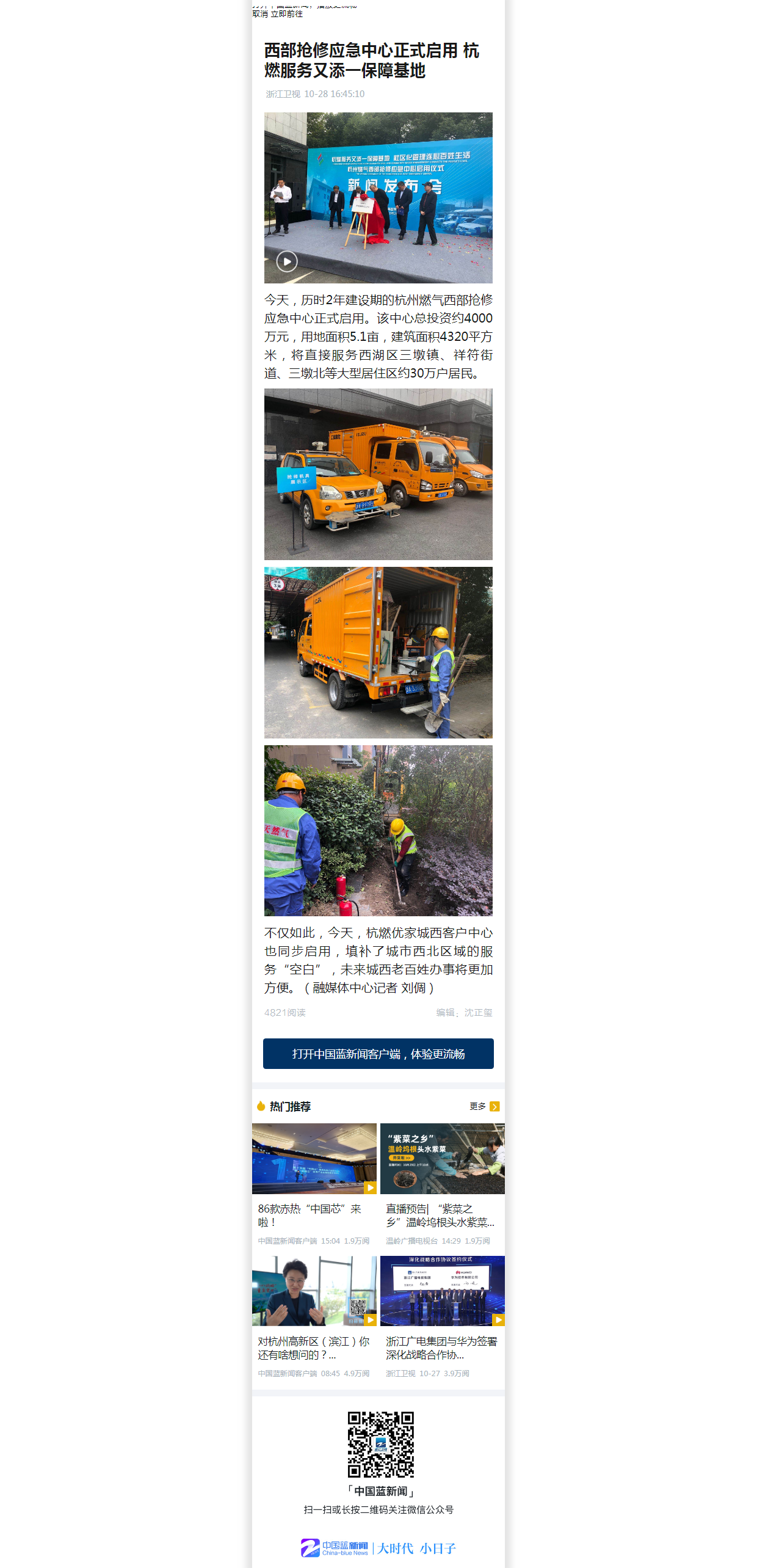 今天,历时2年建设期的银河官网 西部抢修应急中心正式启用。该中心总投资约4000万元,用地面积5.1亩,建筑面积4320平方米,将直接服务西湖区三墩镇、祥符街道、三墩北等大型居住区约30万户居民。