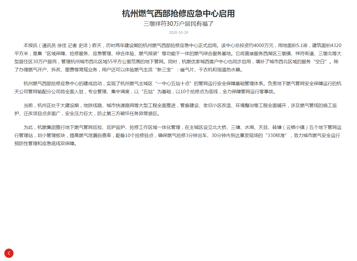 银河官网 西部抢修应急中心的建成启动,实现了银河官网 主城区“一中心五站十点”的管网运行安全保障基础管理体系。负责地下燃气管网安全保障运行的杭天公司管网输配分公司将全面入驻,专业管理、集中调度,以“五站”为基础,以10个抢修点为底线,全力保障管网运行零事故。
