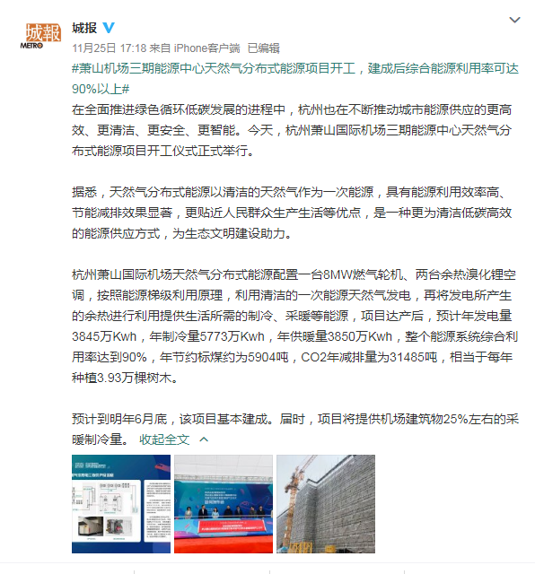在全面推进绿色循环低碳发展的进程中,杭州也在不断推动城市能源供应的更高效、更清洁、更安全、更智能。今天,杭州萧山国际机场三期能源中心天然气分布式能源项目开工仪式正式举行。