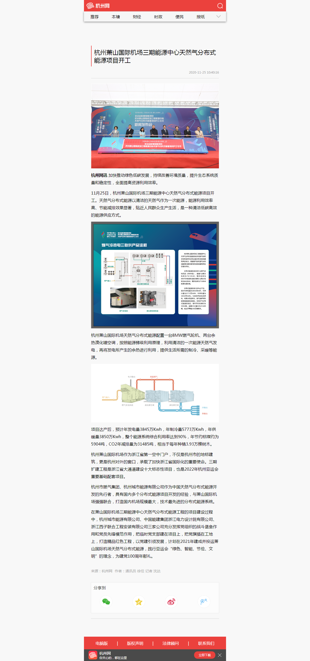 11月25日,杭州萧山国际机场三期能源中心天然气分布式能源项目开工。天然气分布式能源以清洁的天然气作为一次能源,能源利用效率高、节能减排效果显著,贴近人民群众生产生活,是一种清洁低碳高效的能源供应方式。