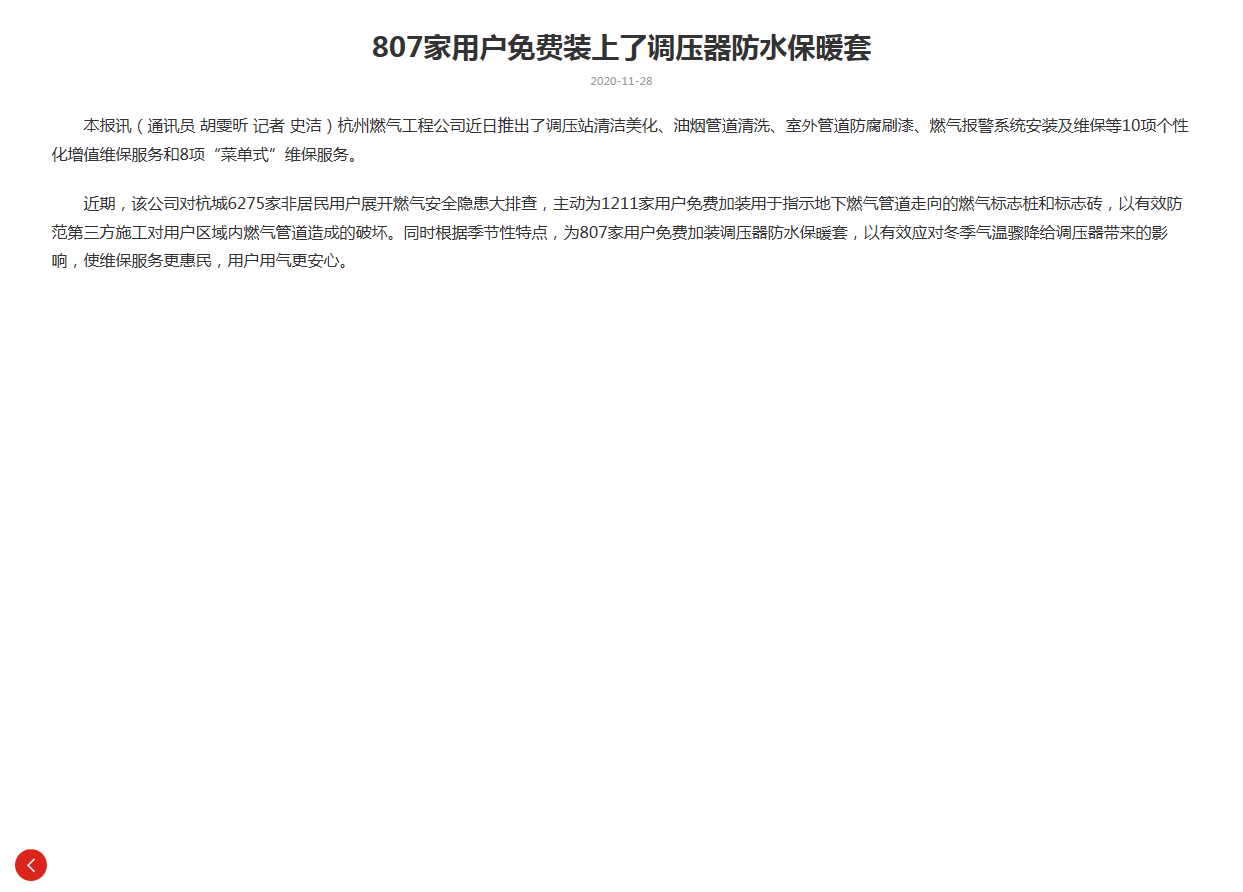 近期,该公司对杭城6275家非居民用户展开燃气安全隐患大排查,主动为1211家用户免费加装用于指示地下燃气管道走向的燃气标志桩和标志砖,以有效防范第三方施工对用户区域内燃气管道造成的破坏。同时根据季节性特点,为807家用户免费加装调压器防水保暖套,以有效应对冬季气温骤降给调压器带来的影响,使维保服务更惠民,用户用气更安心。