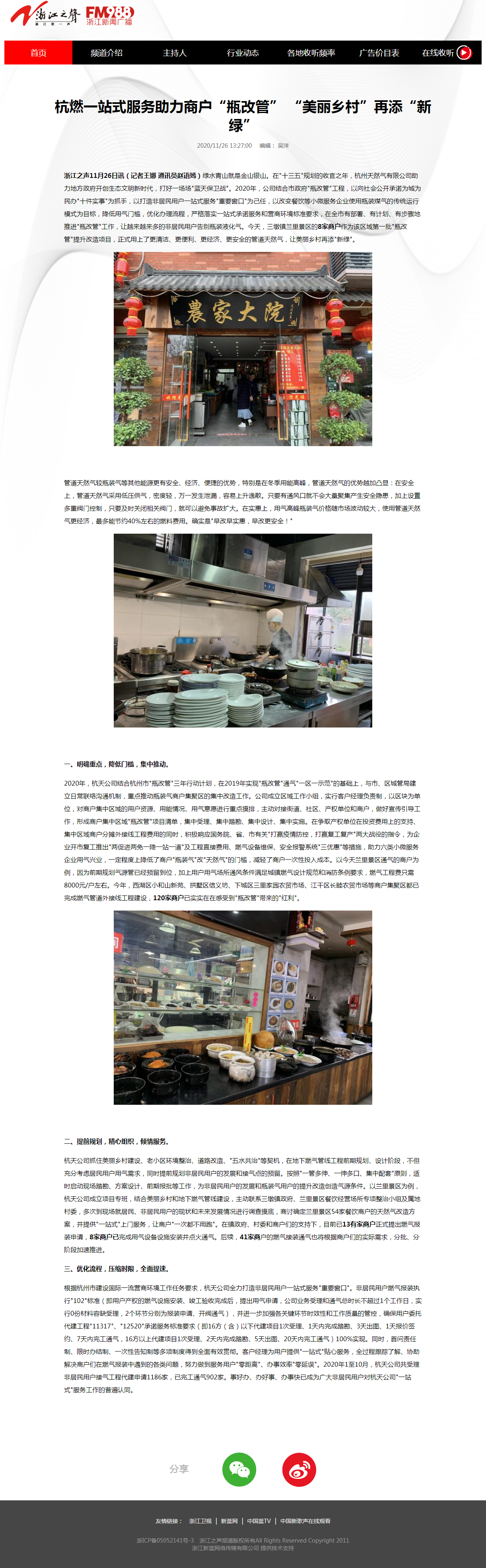浙江之声11月26日讯(记者王娜 通讯员赵语嫣)绿水青山就是金山银山。在"十三五"规划的收官之年,杭州天然气有限公司助力地方政府开创生态文明新时代,打好一场场"蓝天保卫战"。2020年,公司结合市政府"瓶改管"工程,以向社会公开承诺为城为民办"十件实事"为抓手,以打造非居民用户一站式服务"重要窗口"为己任,以改变餐饮等小微服务企业使用瓶装煤气的传统运行模式为目标,降低用气门槛,优化办理流程,严格落实一站式承诺服务和营商环境标准要求,在全市有部署、有计划、有步骤地推进"瓶改管"工作,让越来越来多的非居民用户告别瓶装液化气。今天,三墩镇兰里景区的8家商户作为该区域第一批"瓶改管"提升改造项目,正式用上了更清洁、更便利、更经济、更安全的管道天然气,让美丽乡村再添"新绿"。