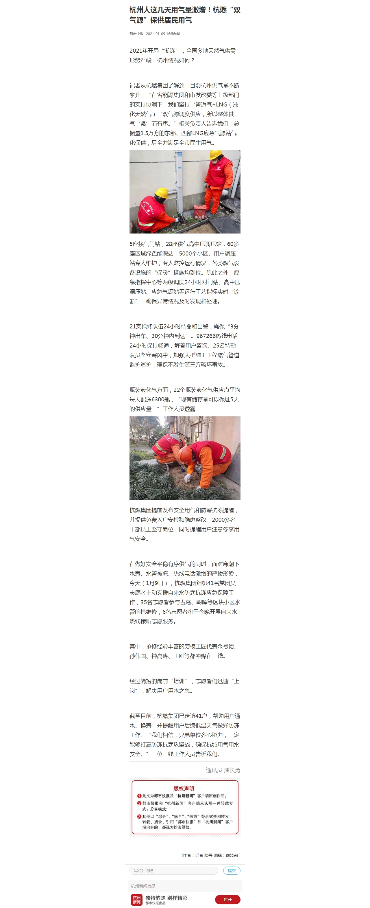 已走访41户,帮助用户通水、换表,并提醒用户后续低温天气做好防冻工作。“我们相信,兄弟单位齐心协力,一定能够打赢防冻抗寒攻坚战,确保杭城用气用水安全。”一位一线工作人员告诉我们。